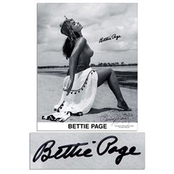 Salacious Bettie Page signed photo. The iconic 1950's pin-up girl signs ''Bettie Page'' in black felt tip along bottom of photo....