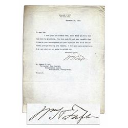 William Howard Taft photo signed. Excellent portrait of Taft in a suit and tie bears his autograph inscription to the border, ''For Mrs. E.J...