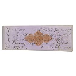 Mark Twain personal check signed in his given name, ''Saml L. Clemens''. First National Bank of Hartford check is dated 2 July 1875 ...