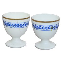 Marlene Dietrich personally owned pair of porcelain egg cups, white with a circular blue pattern flourish along rim. Circa early 20th Century, egg cup