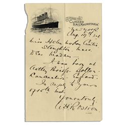 Captain Arthur Rostron autograph letter signed on ''Cunard R.M.S. Mauretania'' stationery, dated August 19th from New York. Rostron ...