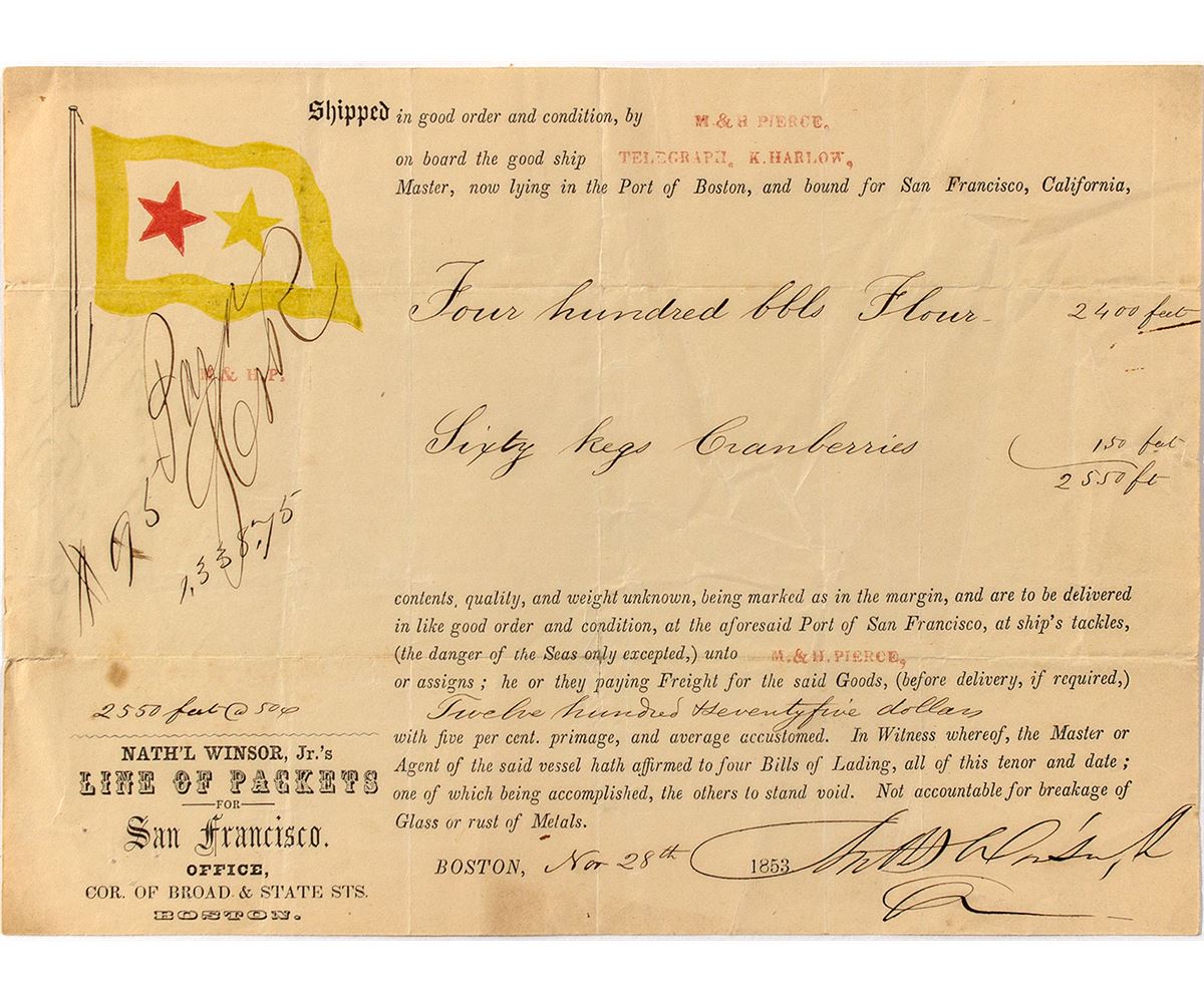Sixty kegs of cranberries and 400 hundred barrels of flour bound for San Francisco from Boston on the good ship Telegraph with captain K. Harlow. To M & H Pierce at a cost of $1275. Yellow lag with yellow and red star.