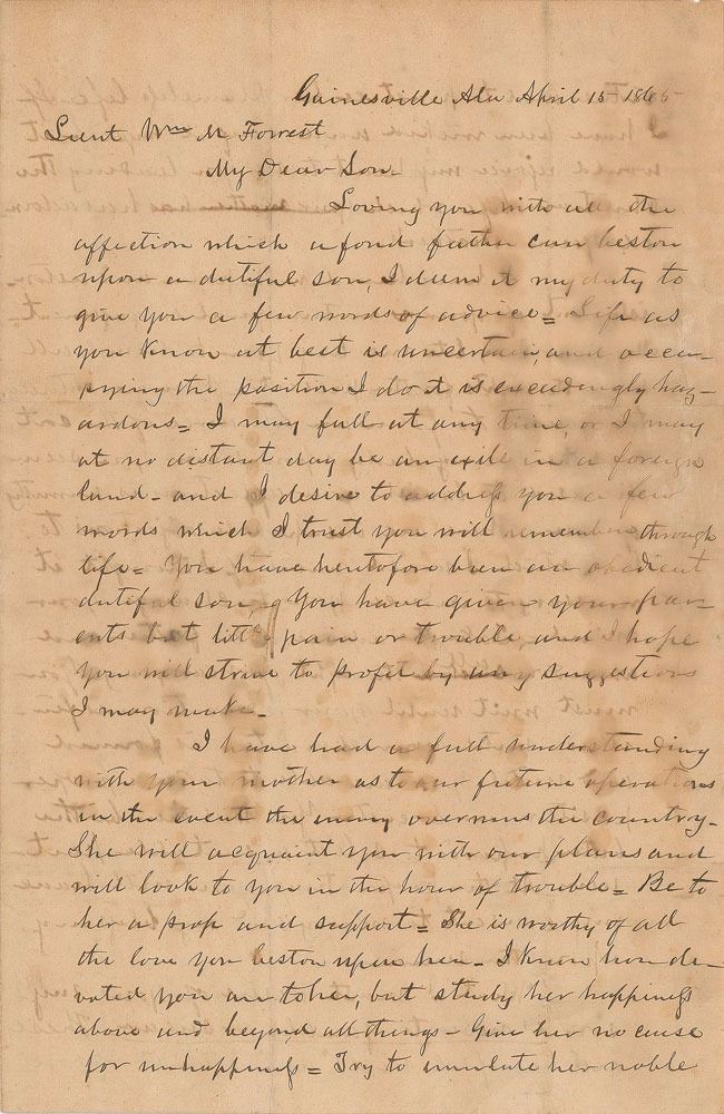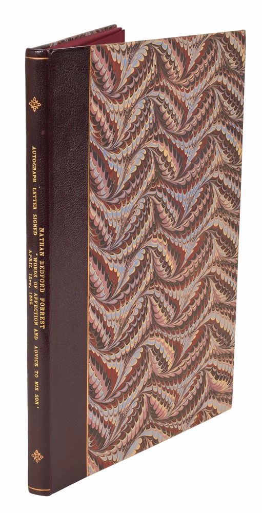 Civil War-dated ALS signed “N. B. F.,” three pages on two adjoining sheets, 7.75 x 12, April 15, 1865. Written on the day of his surrender to Union forces at Gainesville, Alabama, a letter to his son, Lieutenant William M. Forrest, in full: "Loving you with all the affection which a fond father can bestow upon a dutiful son, I deem it my duty to give you a few words of advice. Life as you know at best is uncertain, and occupying the position I do it is exceedingly hazardous. I may fall at any time, or I may at no distant day be an exile in a foreign land, and I desire to address you a few words which I trust you will remember through life. You have heretofore been an obedient dutiful son, you have given your parents but little pain or trouble, and I hope you will strive to profit by using suggestions I may make.