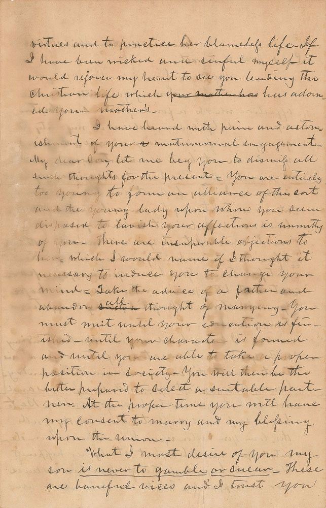 I have had a full understanding with your mother as to our future operations in the event the enemy overruns this country. She will acquaint you with our plans and will look to you in the hour of trouble. Be to her a prop and support. She is worthy of all the love you bestow upon her. I know how devoted you are to her, but study her happiness above and beyond all things. Give her no cause for unhappiness. Try to emulate her noble virtues and to practice her blameless life. If I have been wicked and sinful myself, it would rejoice my heart to see you leading the Christian life which has adorned your mother’s. I have heard with pain and astonishment of your matrimonial engagement. My dear son, let me beg you to dismiss all such thoughts for the present. You are entirely too young to form an alliance of this sort and the young lady upon whom you seem disposed to lavish your affections is unworthy of you. There are insuperable objections to her, which I would name if I thought it necessary to induce you to change your mind. Take the advice of a father and abandon such all thought of marrying. You must wait until your character is formed and you are able to take a proper position in society. You will then be the better prepared to select a suitable partner. At the proper time you will have my consent to marry and my blessing upon the union.