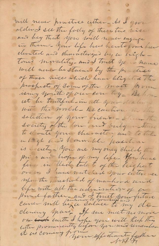 What I must desire of you my son is never to gamble or swear. These are baneful vices and I trust you will never practice either. As I grow older I see the folly of these two vices and beg that you will never engage in them. Your life has heretofore been elevated and characterized to a high-toned morality, and I trust your name will never be stained by the practice of those vices which have blighted the prospects of some of the most promising youth of our country. Be honest, be truthful, in all your dealings with the world. Be cautious in the selection of your friends. Shun the society of the low and vulgar. Strive to elevate your character and to take a high and honorable position in society. You are my only child, the pride and hope of my life. You have fine intellect, talent of the highest order. I have watched your entrance upon the threshold of manhood and life with all the admiration of a proud father, and I trust your future career will be an honor to yourself and a solace to my declining years. If we meet no more on earth I hope you will keep this letter prominently before you and remember it as coming from Your affectionate father.” In very good condition, with scattered dampstaining (not affecting readability), and old mounting remnants on the reverse of the final page. Accompanied by a custom-made presentation folder.