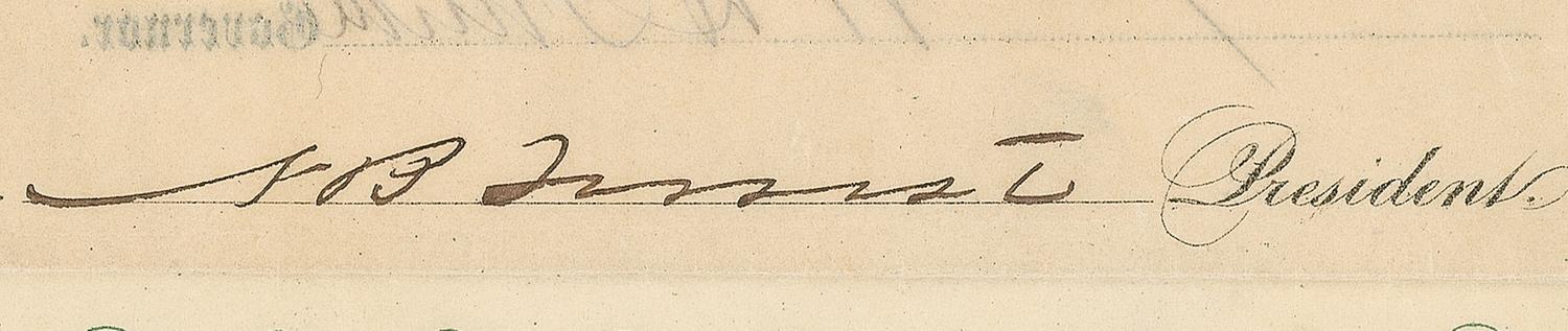 Partly printed DS, signed twice “N. B. Forrest,” one page both sides, 16.75 x 20, September 1, 1869. A handsomely engraved (including a vignette of black cotton workers) first mortgage bond for the Selma Marion Memphis Railroad Company in the amount of $1,000. Thirty-three of the coupons remain attached to the lower portion. Forrest has signed as president of the company on both sides of the document. In very good condition, with a few small separations along intersecting folds (pinholes at intersections), some small tape repairs to paper loss to upper portion, scattered mild wrinkling and toning, and a few small spots of ink erosion. The signatures are dark and distinct. An ornate postbellum document.