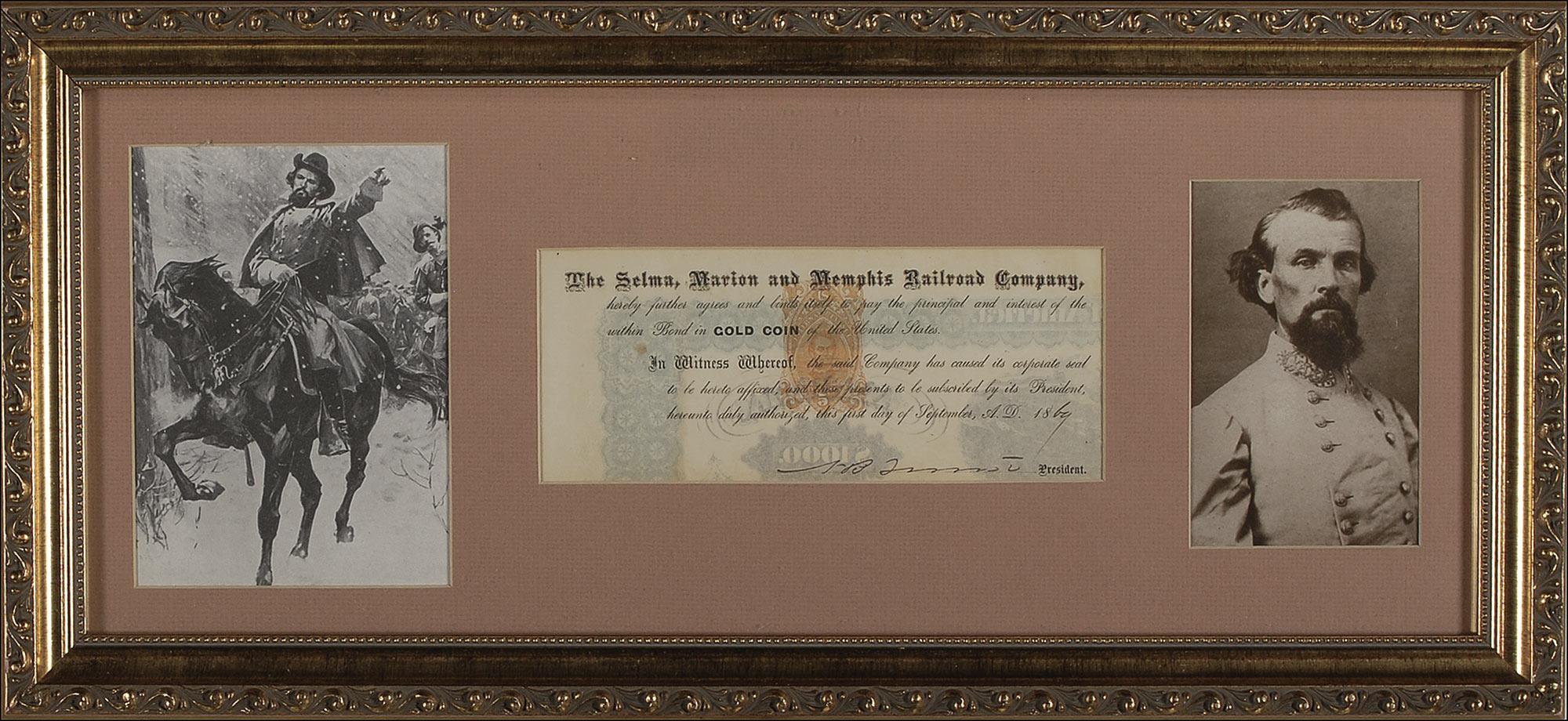 Confederate general (1821–1877) who earned a reputation as the greatest cavalry officer of the Civil War. A subject of controversy even in his own lifetime, Forrest’s military legacy remains permanently clouded by his prewar career as a millionaire slave trader and, later, his role as first Grand Wizard of the Ku Klux Klan. Self-contained partial DS, signed “N. B. Forrest,” one page, 8 x 3.5, September 1, 1869. A guarantee for the payment of the principal and interest of a bond from the Selma, Marion, and Memphis Railroad Company, payable in gold coin. Matted and framed with two portraits of Forrest, to an overall size of 22.25 x 10.5. In fine condition, with light show-through from printing on reverse, and some scattered mild toning. Pre-certified PSA/DNA and RRAuction COA.