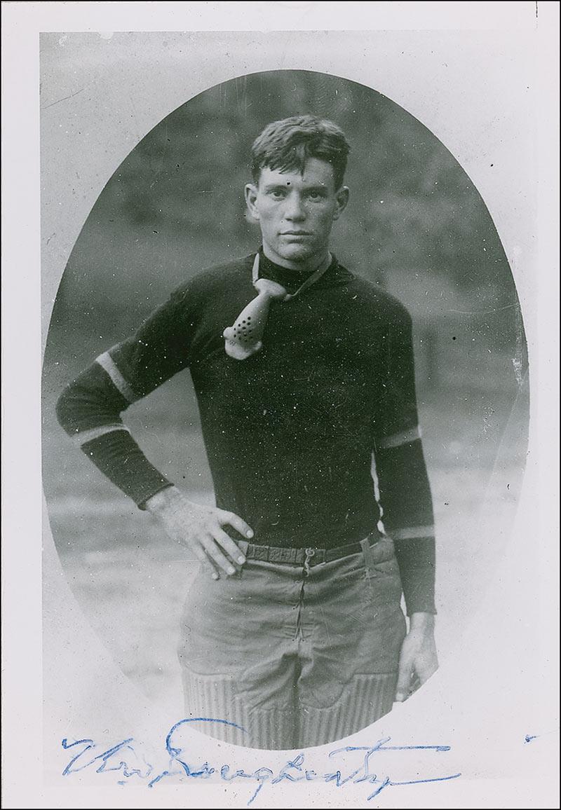 College Football Hall of Famer (1886-1977) who played for the Tennessee Volunteers. He later became the Dean of the College of Engineering at the University of Tennessee. Glossy 3.5 x 5 photo of Dougherty from his playing days, signed in blue ballpoint. Light skipping, irregular ink adhesion, and a couple small brushes to signature, otherwise fine condition.