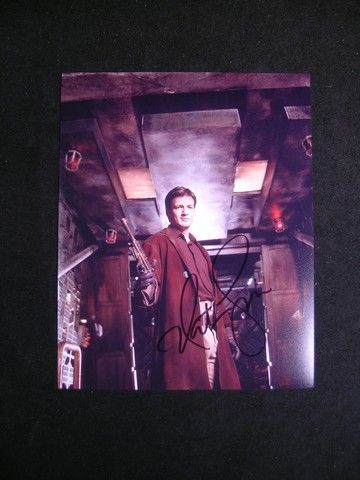 A signed, glossy color photo of actor Nathan Fillion. Nathan has appeared in numerous television series as an actor and voiceover talent, including roles in Desperate Housewives, Drive, Buffy the Vampire Slayer and Firefly, which this photo comes from. The photo is signed in black felt ink. (measures approx. 8"x 10")