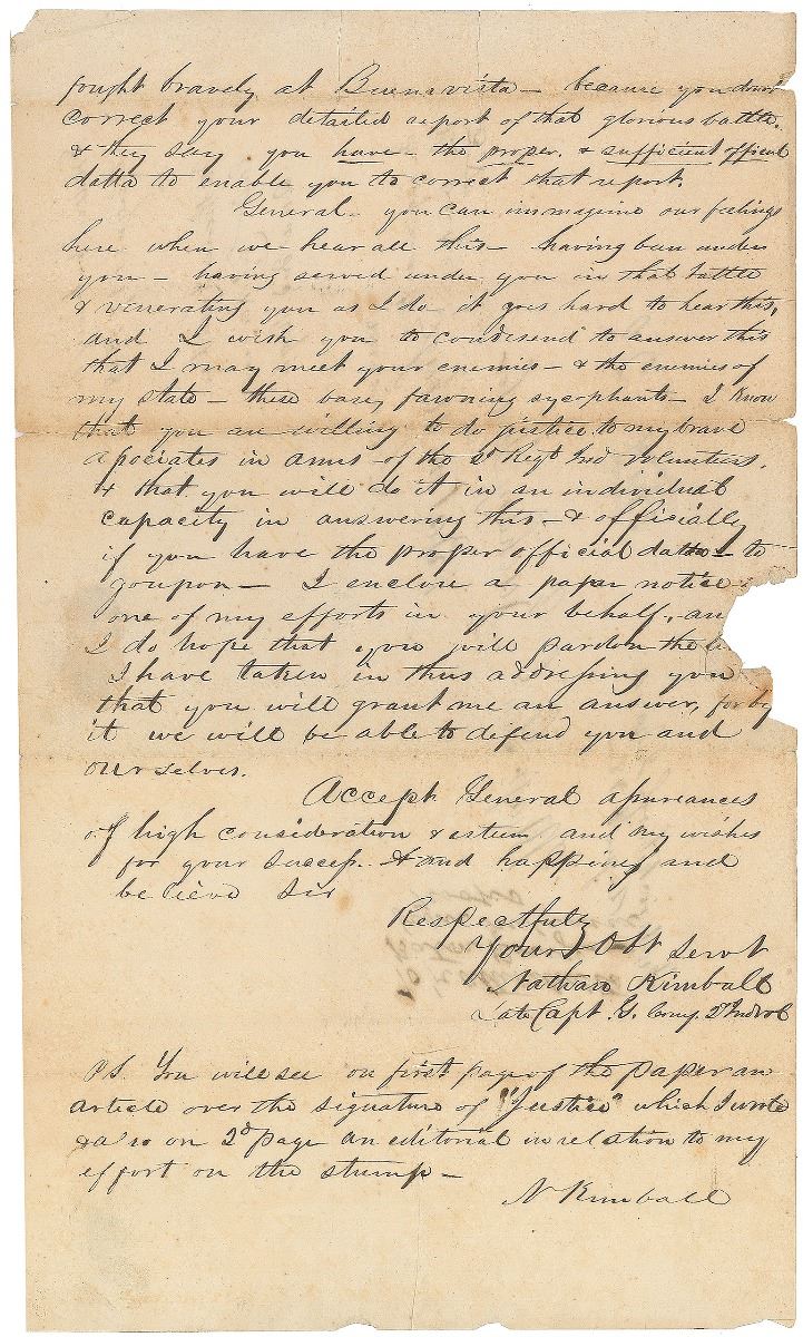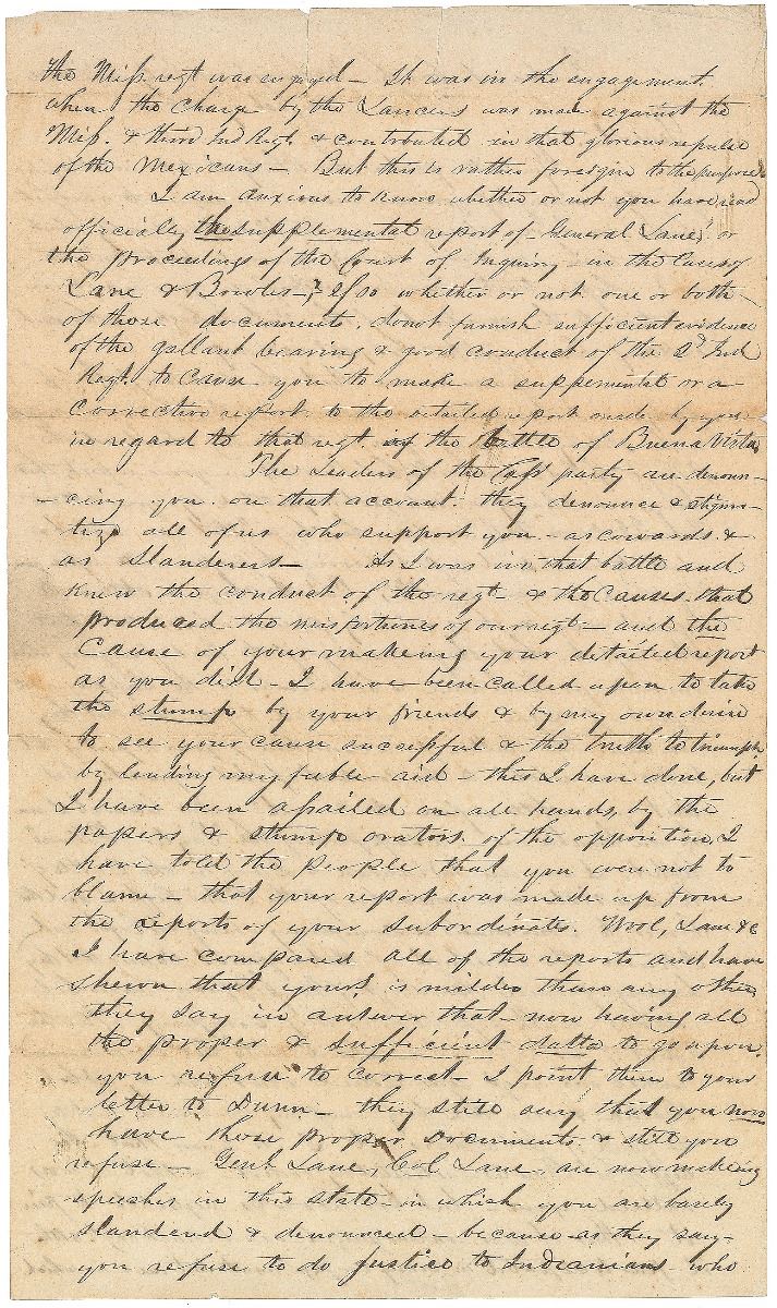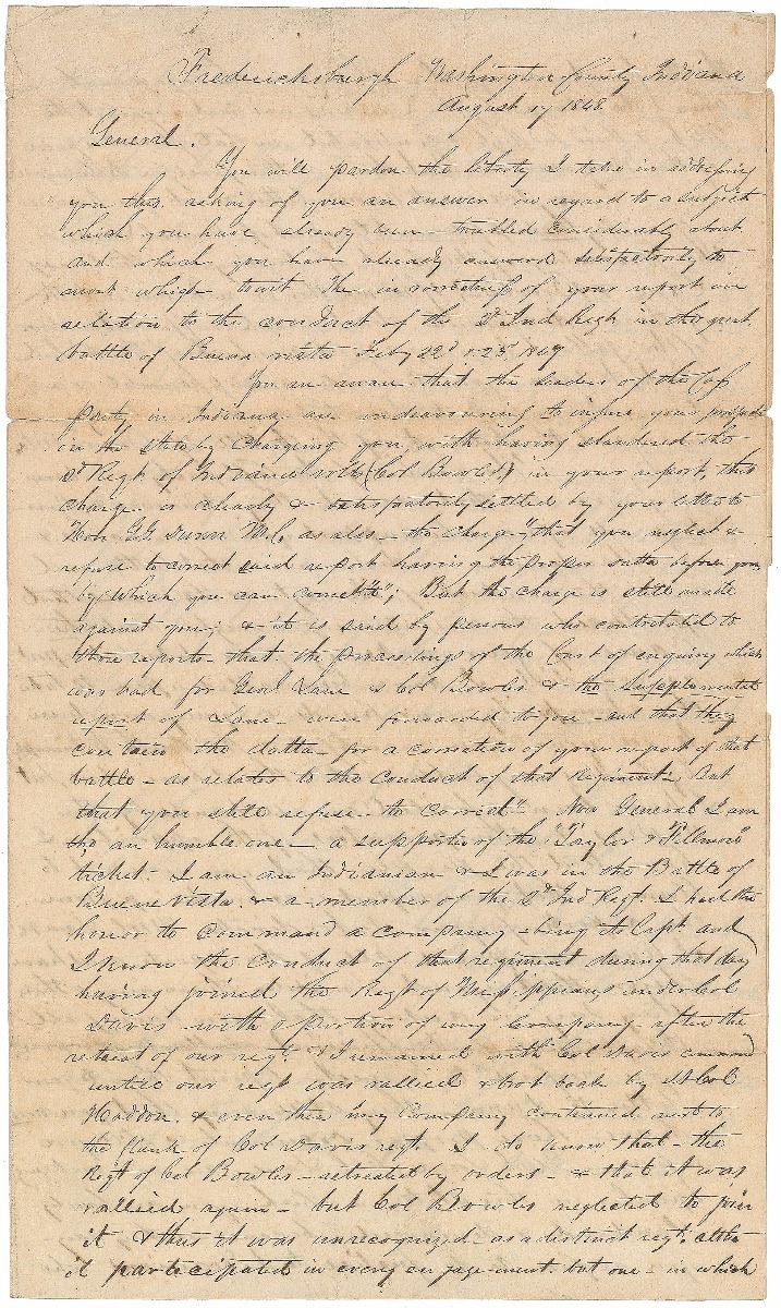 Now General I am an humble one—a supporter of the ‘Taylor & Fillmore’ ticket. I am an Indianan & I was in the Battle of Buena Vista & a member of the 2d Ind Regt. I had the honor to command a company—being its Capt and I know the conduct of the regiment during that day…I am anxious to know whether or not you have officially received the supplemental report of General Lane…in the Cause of Lane & Bowles & also whether or not one or both of those documents don’t furnish sufficient evidence of the gallant bearing & good conduct of the 2d Ind Regt. to cause you to make a supplemental or a corrective report to the Detailed report made by you in regard to that regt. in the battle of Buena Vista.