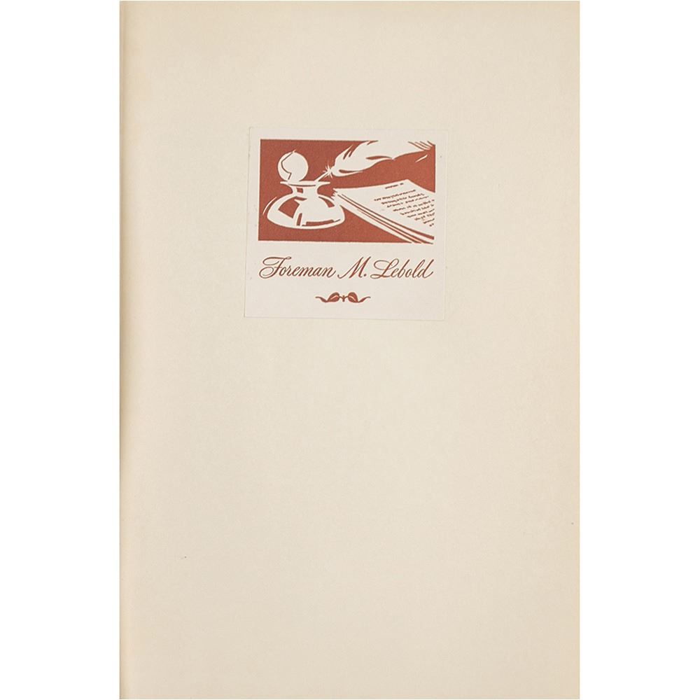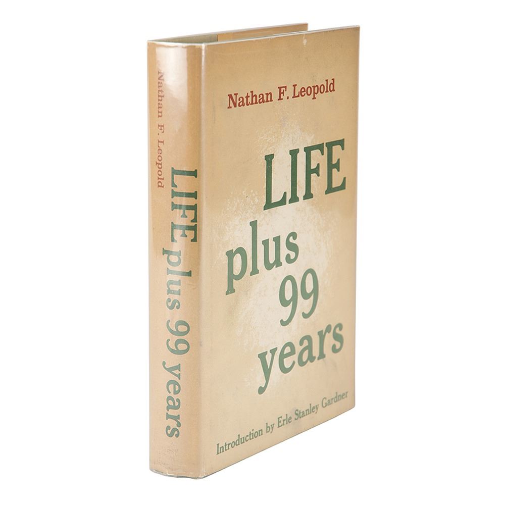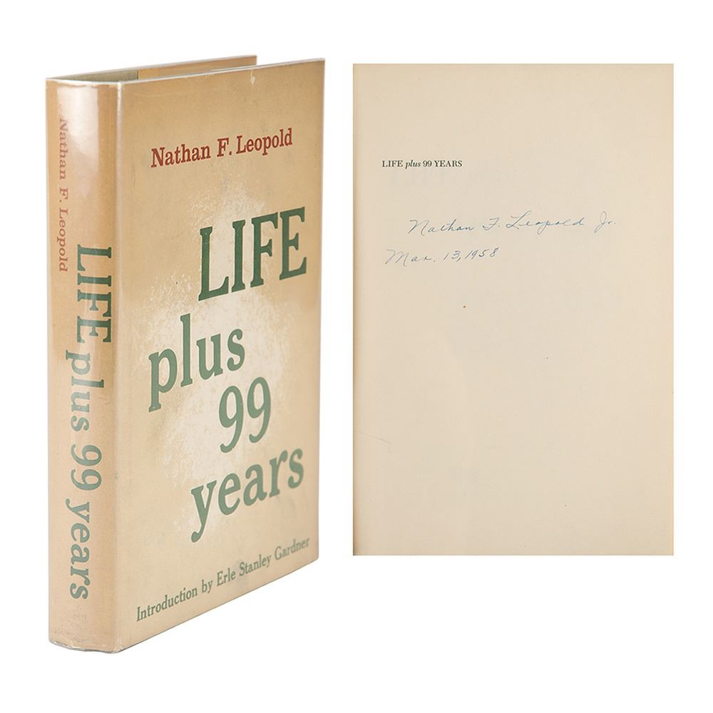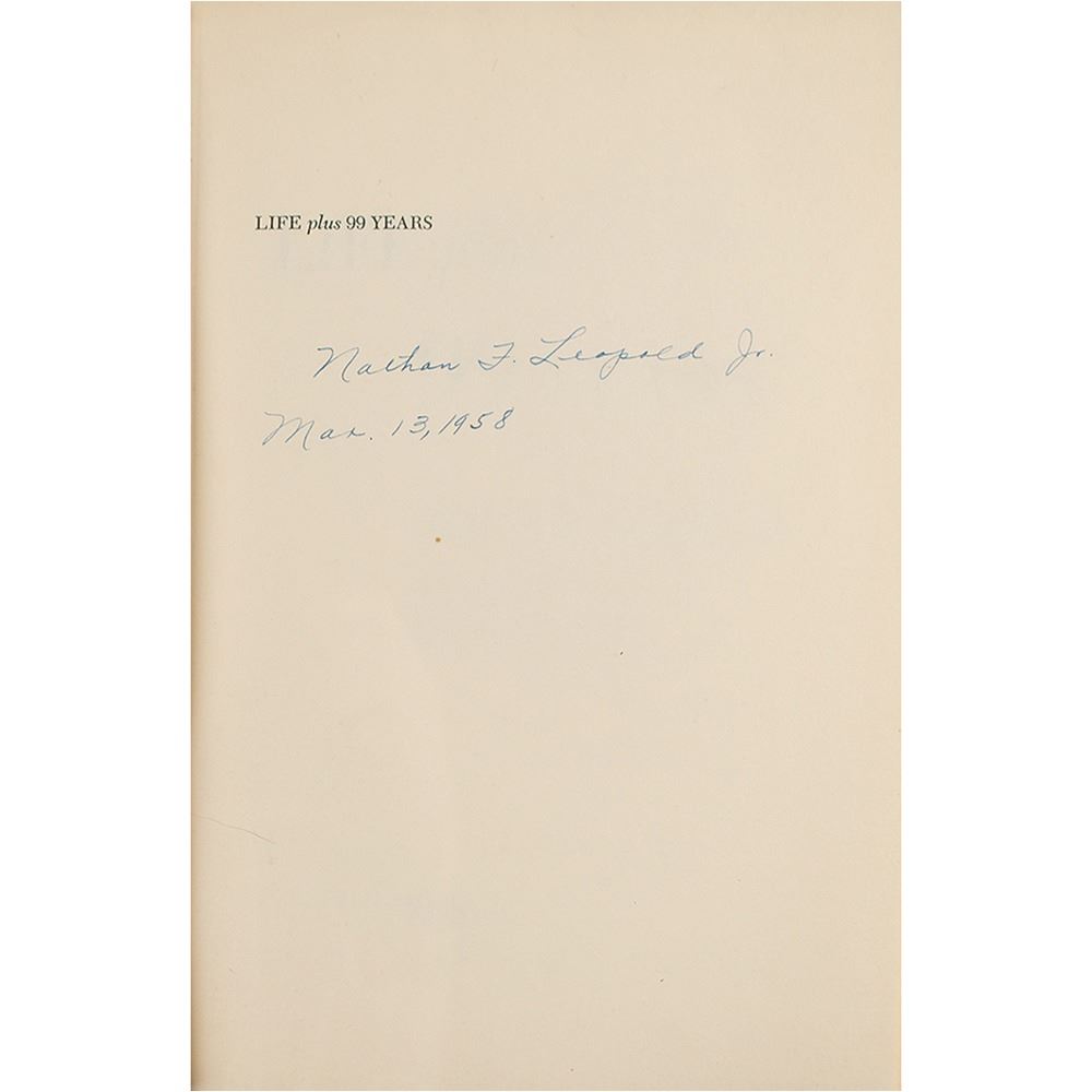 Signed book: Life Plus 99 Years. First edition. Garden City, NY: Doubleday, 1958. Hardcover with dust jacket, 6.5 x 9.5, 381 pages. Signed on the half-title page in fountain pen, "Nathan F. Leopold, Jr., Mar. 13, 1958." Affixed to the first free end page is the personal bookplate of Leopold's older brother, Foreman M. Lebold, who, like some other family members, changed his surname to disassociate himself from the notoriety of the crime and subsequent trial. In fine condition. A fantastic association copy.