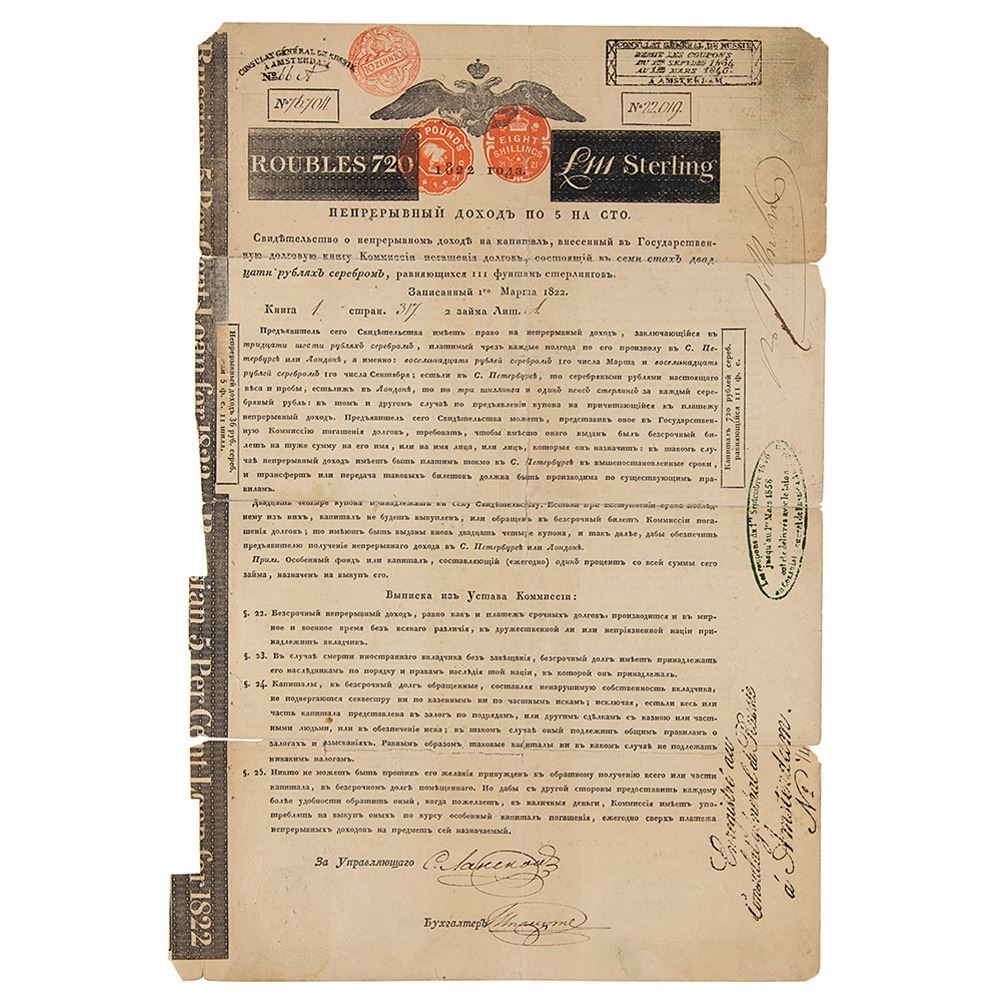 European Jewish financier (1777–1836) who founded his family’s famous banking dynasty and handled Allied loans for the campaign against Napoleon. Rothschild helped to ensure Britain’s preeminence as a financial market when bonds he handled as an investment banker were denominated in sterling and the interest made payable to London in pounds. Among the powers availing themselves of the new arrangements was Czarist Russia, which floated a loan for £3,500,000 in 1822. Partly-printed DS in Russian, English, and French, signed “N. Rothschild,” one page, 9.75 x 14.25, March 1, 1822. Russian imperial bond for 720 rubles, signed in the upper right margin in ink by Rothschild. In very good to fine condition, with chipping to the edges, and tape reinforcements to complete separations along horizontal folds.