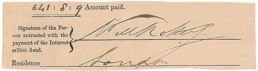 Jewish financier (1840–1915) who succeeded his father, Lionel, as head of the family’s London banking operations. Ink signature, “N. M. Rothschild, London,” on an off-white 6 x 1.5 slip clipped from a financial document concerning an interest payment of £41.8.9. Two vertical folds passing through single letters of the signature, a few tiny edge tears, and slight show-through from mounting remnants to reverse, otherwise fine condition.