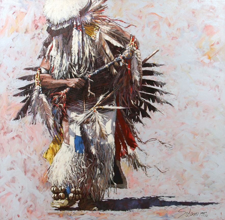 Nathan Solano. Dances with Coupstick. 48" x 48" oil on canvas. Signed lower right: Solano 1997 © . (est. $5,000-7,000). CONDITION REPORTS: www.auctioninsantafe.com/docs/cr2012.pdf