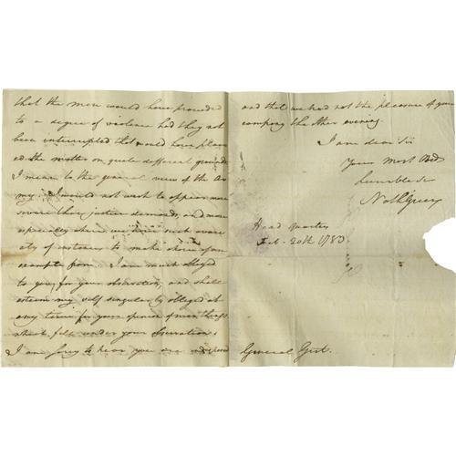 <B>Nathanael Greene Great Autograph Letter on Military Justice in the Continental Army!</B></I> Autographed Letter Signed, <I>as Major General,</B></I> 3 pages, recto and verso, 7.5" by 9", Head Quarters, February 20, 1783. To <B>General Mordecai Gist.</B></I> In very fine condition, with some minor traces of mounting on margin on 4th integral leaf where, too, it is noted, there is a small hole, not affecting the text, where a wax seal was removed. Nathanael Greene emerged from the Revolution with a reputation as the outstanding patriot general of his age: this letter reveals why. "<I>You are perfectly right in your observations, licentiousness ought to be checked and discipline preserved; but from the state of the evidence in the case you mention I am in doubt whether the Court could be brought to condemn them to death. It is best in matters of life and death to have the crime to found it on, rather than the intention. In the present case there is no doubt but that the men would have proceeded to a degree of violence had they not been interrupted that would have placed the matter on quite different grounds: I mean to the general view of the Army. I would not want to appear more severe than justice demands; and more especially where we have such a variety of instances to make choice of an example from. I am much obliged to you for your observations; and shall esteem myself singularly obliged at any time for your opinion of men [&] things which fall under your observation...</B></I>" From the Henry E. Luhrs Collection. Accompanied by LOA from PSA/DNA.