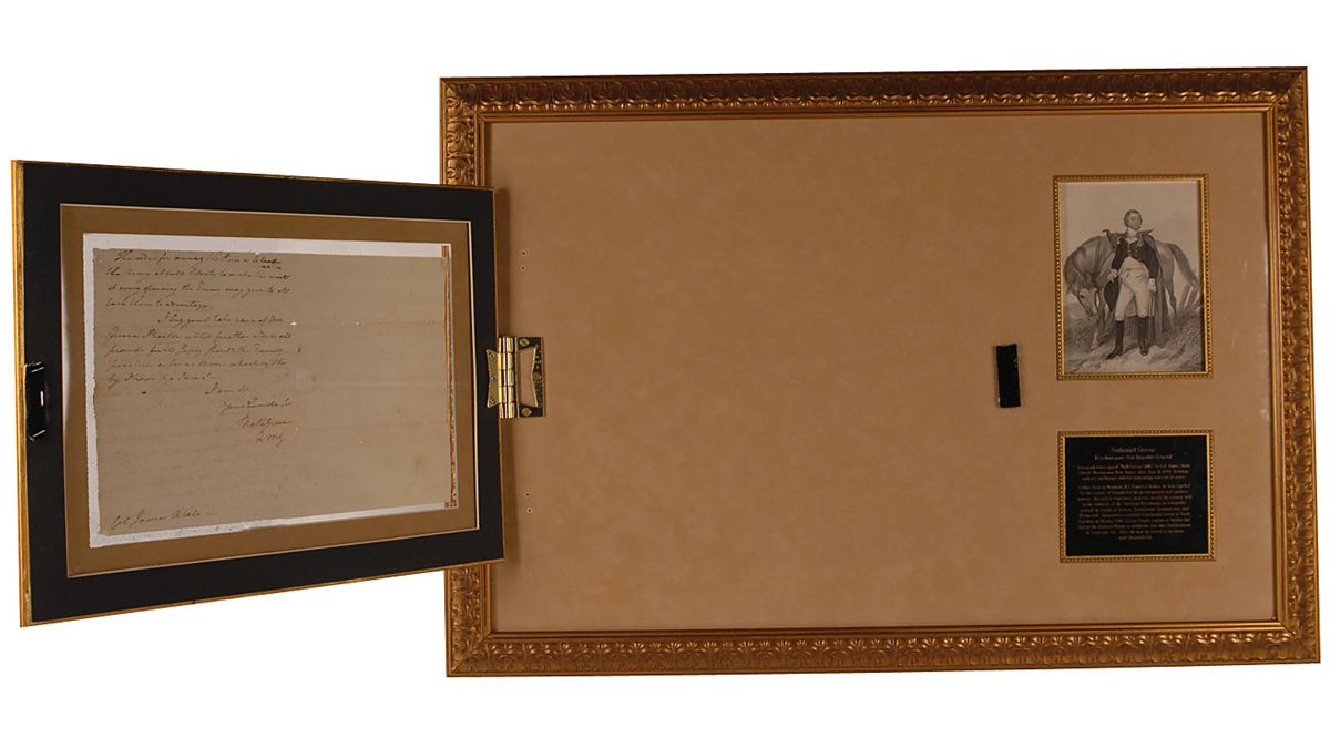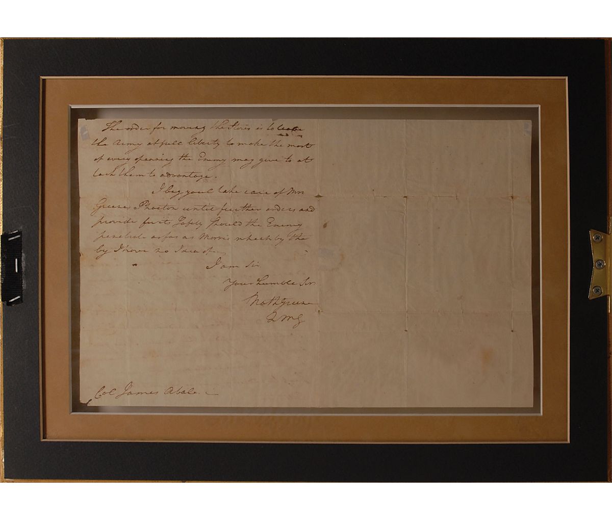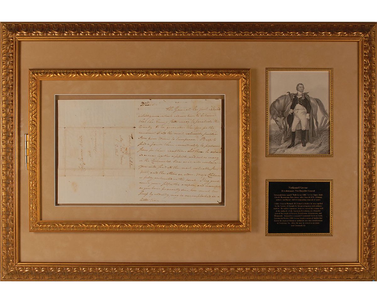 Major General in the Continental Army (1742–1786). He entered the army as a private and rose to become one of Washington’s most able and dependable general officers. He is best known for his exploits in the Southern Theater where he single-handedly reversed the tide of the war from 1780 to 1781. His actions set the stage for Cornwallis’ defeat at Yorktown. Revolutionary War-dated ALS signed “Nath Greene QMG,” one page both sides, 7.25 x 9, no date, but circa June 1780. Letter to Colonel James Abale. In part: “The General has just received Intelligence which induces him to believe that the Enemy still mean to penetrate the country. He has given order therefore for the removal of all the most valuable public stores from Morris to Succasunna. Please to find a person there immediately to prepare Stores for their reception. Let them be deposited as near together as possible; and put as many on the Continental store as it will contain. You will send off the most valuable Stores first, and then the others in order. Major Claborne is fully entrusted in this…The order for moving the stores is to leave the Army at full liberty to make the most of every opening the Enemy may give to attack them to advantage. I beg you’ll take care of Mrs. Greene’s Phaeton until further orders and provide for its safety should the Enemy penetrate as far as Morris which by the by I have no idea of.” Reverse of second integral page bears an address panel to Abale at Morristown; later docketed incorrectly as “Camp Springfield Jun 1779.”. Letter is suede-matted and framed, with glass on both sides, to an overall size of 19 x 14. This frame is in turn affixed by a hinge on its left edge to a larger suede-matted display with an engraved portrait of Greene and an informational plaque to an overall size of 33 x 23. In fine condition, with intersecting folds, a few chips of paper loss to edges, and some scattered light toning.