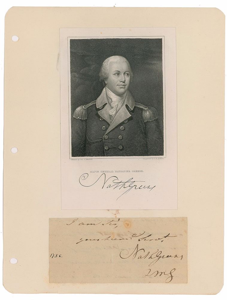 Major General in the Continental Army (1742–1786) who entered the army as a private and rose to become one of Washington's most able and dependable general officers; he is best known for his exploits in the Southern Theater, actions which set the stage for Cornwallis' defeat at Yorktown. Ink signature, "Nath. Greene, QMG,” on an off-white 5.25 x 2.5 sheet clipped from a letter or document. The signature is affixed to a larger sheet bearing an engraving of Greene. In very good to fine condition, with trimmed edges, intersecting folds, and writing showing through from the reverse.
