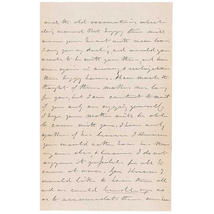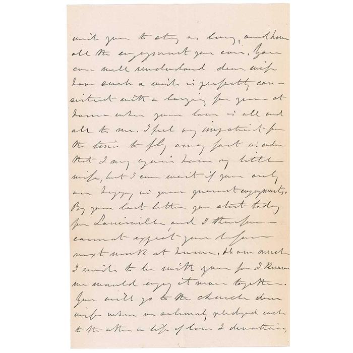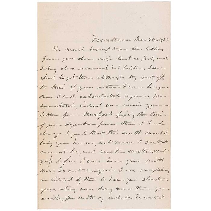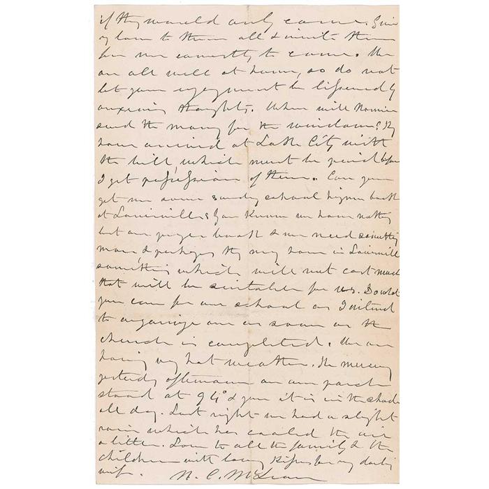Union general during the Civil War (1815 -1905). ALS signed “N. C. McLean,” four pages on two adjoining sheets, 4.75 x 7.5, June 29, 1868. Lengthy letter to his wife, written from a small outpost in Minnesota. In part: “Ever since your letter from New York fixing the time of your departure from there I had always hoped that this week would bring you home, but now I see that cannot be, and another week must pass before I can have you with me…You can never understand dear wife how such a wife is perfectly consistent with a longing for you at home when your love is all and all to me. I feel very impatient for the time to fly away fast in order that I may again have my little wife.” Accompanied by the original mailing envelope, with the stamp clipped off. In fine condition, with intersecting folds, one through a single letter of signature, and light overall toning. RRAuction COA.