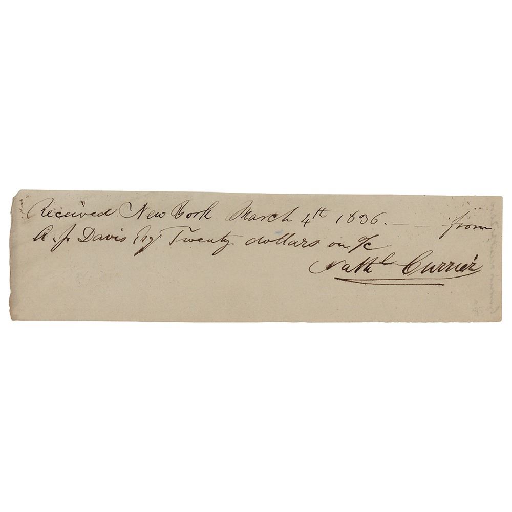 Scarce ADS, signed “Nath'l Currier,†one page, 8 x 2.25, March 4, 1836 in New York. Handwritten receipt from Currier who notes that he received $20 from A. J. Davis. In fine condition. This marks the first item signed by Currier that we have ever offered.