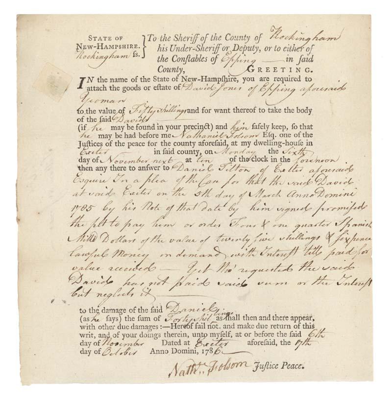 NATHANIEL FOLSOM (1726-1790). American merchant and statesman. Partially Printed Autograph Document Signed, Nathl. Folsom.” One page, 7 7/8” x 8 1/4.” October 17, 1786. Exeter, NH. The document reads. In part: In the name of the state of New-Hampshire, you are required to attach the goods or estate of David Jones of Epping aforesaid Yeoman to the value of fifty shillings and for want thereof to take the body of the said Davidso that he may be had before me Nathaniel Folsom Esq. one of the Justices of the peace for the country aforesaid hereof fail not and made due return of this writ, and of you doings therein, unto myself, at or before the said 6th Day of November ” Born in 1726, Nathaniel Folsom had a long and varied life of service to the American colonies, and later, to the young American nation. As a young man, Folsom served in the New Hampshire Provisional Regiment, eventually becoming a Colonel of the Militia. A patriot to his core, Folsom hastily answered the call for troops at the advent of the American Revolution. The senior office for militia in New Hampshire, Folsom was later named Brigadier General and oversaw the recruitment, training, and supply of that state’s troops throughout the war. In addition to these duties, Folsom also served as brigadier general of New Hampshire troops during the siege of Boston and planned the details of troops sent from New Hampshire to Ticonderoga. Once the American nation had won its freedom, Folsom played a role in the politics of both New Hampshire and the nation as a delegate to the First Continental Congress and a member of the New Hampshire Committee of Safety. After serving in a variety of posts in his home state, Folsom was eventually named Chief Judge of Rockingham County, New Hampshire, a post he held until his death in 1790.