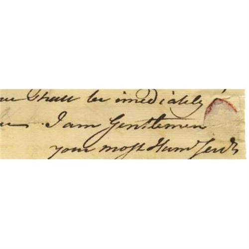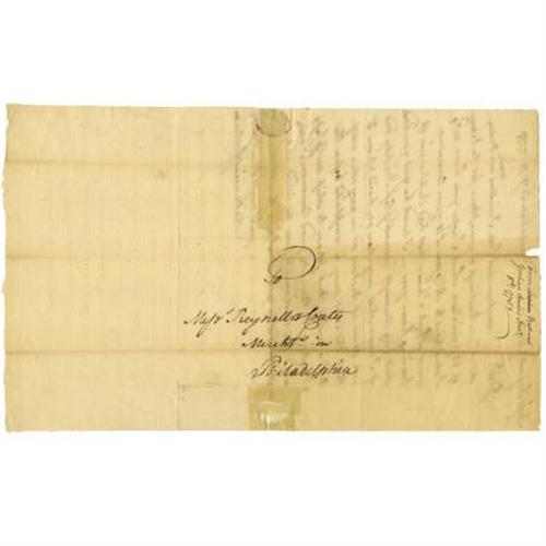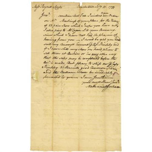 <B>Nathaniel Gorham Autograph Letter Signed</B></I> "<I>Nathaniel Gorham,</B></I>" one page, 7.5" x 10.5". Charlestown, February 21, 1775. Addressed by Gorham on verso "<I>To/ Messrs Reynell & Coates/ Merchts in/ Philadelphia.</B></I>" In part, "<I>Sometime last Fall, I inclosed to you an Order on Mr. Mackiness of your place for the Value of 53 pair Shoes - which I hope you have recd. I also paid to Mr Logan £10 your Currency since which I have not had the pleasure of hearing from you…if I have still any shoes on hand please to sell them at Auction…Please to ship me to Capt Hinckley 25 Barrells good Common Flour…</B></I>" Nathaniel Gorham, a signer of the Constitution, represented Massachusetts in the Continental Congress in 1782, 1783, 1786, 1787, and 1789, and was its president from June 6, 1786, to February 2, 1787. Repaired at the mid-horizontal fold on verso with glassine, the letter has a small piece missing at the upper edge, one fold partially separated at the right edge, and a seal tear hole in the blank left margin. Darkly penned, the letter is in fine condition.<BR><BR><b>Shipping:</b> Flat Material, Small (<a target="_blank" href="http://www.heritageauctions.com/common/shipping.php">view shipping information</a>)
