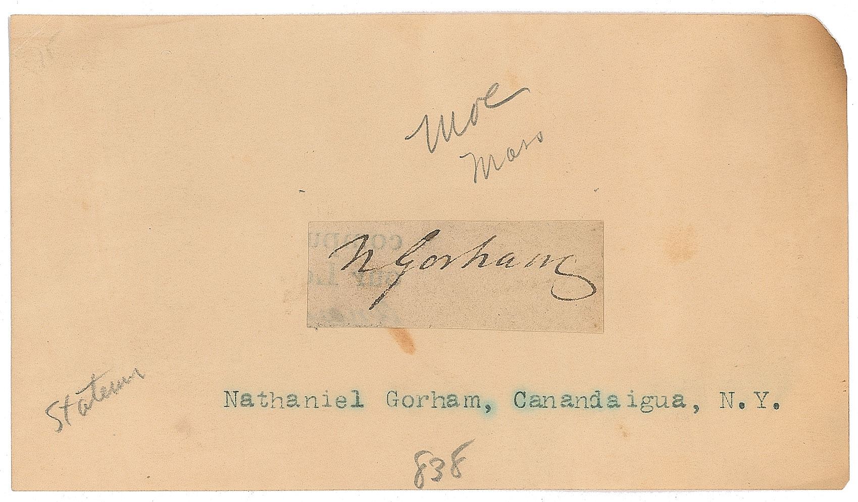 Massachusetts delegate (1738–1796) and president to the Continental Congress, who was one of the signers of the United States Constitution. Uncommon ink signature, "N. Gorham,” on an off-white 1.75 x .75 slip, affixed to a slightly larger album page; the typed caption apparently mistook this signature of Nathaniel Gorham, Sr., as Nathaniel Gorham, Jr., who moved to Canandaigua around 1800. In fine condition, with show-through from some type on the reverse. Provenance: the collection of Charles Forbes, who purchased this piece in 1949.