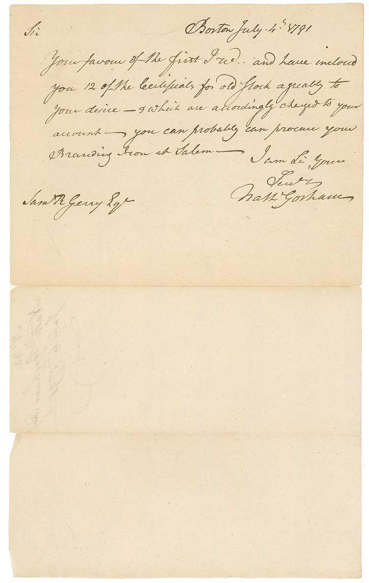 Eighth President of the United States in Congress (1738–1796) under the Articles of Confederation, a post he held in 1786. ALS signed “Nath. Gorham,” one page, 7.25 x 12, July 4, 1791. Gorham writes from Boston to Sam. R. Gerry. In full: “Your favour of the first I recd. and have inclosed your 12 of the Certificates for old stock agreably [sic] to your desire—& which are accordingly charged to your account— You can probably procure your Branding Iron at Salem….” Accompanied by two 1792 documents from Gorham to Gerry, bearing evidently secretarial signatures, a vintage postcard-style image, and a folder from dealer Walter R. Benjamin. Horizontal folds with a few edge separations (not affecting text) and scattered light toning and soiling, otherwise fine condition. RRAuction COA.
