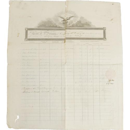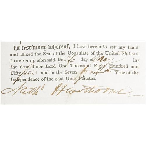 <B>Nathaniel Hawthorne Document Signed</B></I> "<I>Nathl Hawthorne</B></I>". One page, 9" x 14.5", Liverpool, May 26, 1855. A departure record signed for the ship <I>Jane Parker.</B></I> The document lists the dozen sailors aboard the ship, as well as their ages, heights, and wages. The document has an impressed seal and Hawthorne's signature is large and dark. Attached to Hawthorne's signed document is another document detailing the crew and ship. There is a third document from the American Consulate in Antwerp for the <I>Jane Parker.</B></I> In 1855, Hawthorne was the American Consul at Liverpool. He left the United States in 1853 to travel to Europe. He spent seven years there before returning to Concord to resume his writing. One of the most celebrated American authors, Hawthorne wrote short stories and novels which dealt with the interior workings of the heart, the nature of sin, and New England's Puritan past. The archive has the usual folds associated with any papers carried on a ship but is in fine condition overall.<BR><BR><b>Shipping:</b> Books & Catalogs (<a target="_blank" href="http://www.heritageauctions.com/common/shipping.php">view shipping information</a>)