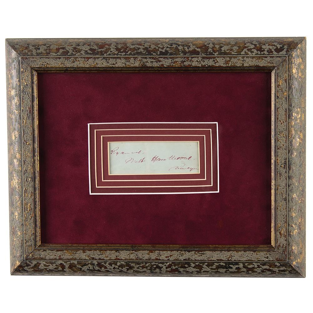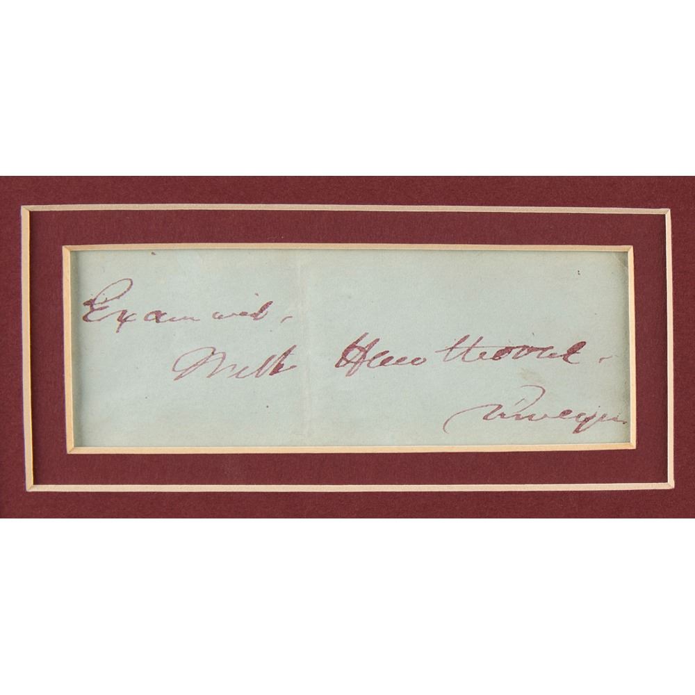 Ink signature, "Examined, Nath. Hawthorne,” on an off-white 3.5 x 1.25 slip, impressively quadruple-matted and framed to an overall size of 12.25 x 9.75. In fine condition, with a faint central vertical fold.