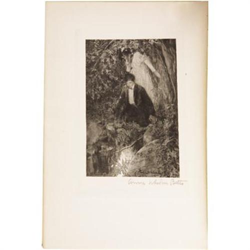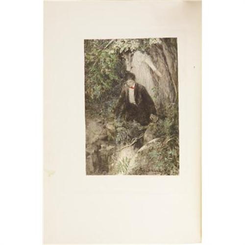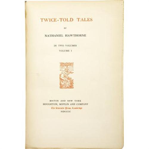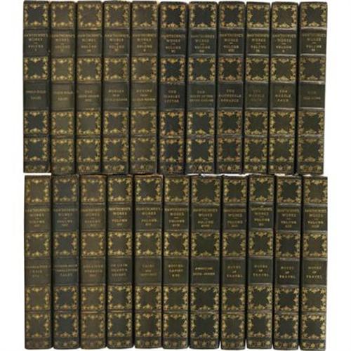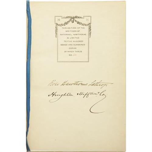 <B>Nathaniel Hawthorne. </B></I><B><I>The Complete Writings of Nathaniel Hawthorne</B></I></B></I><B>.</B></I> With Portraits, Illustrations, and Facsimiles. In Twenty-Two Volumes. Boston and New York: Houghton, Mifflin and Company, 1900.<BR><BR>Autograph Edition. Limited to 500 numbered copies (this copy being No. 64), signed by Rose Hawthorne Lathrop and the publisher. Twenty-two octavo volumes (8.6875 x 5.875 inches). Titles printed in red and black. Photogravure frontispieces, added vignette titles, and plates, all on India paper mounted, from photographs by Alinari and Clifton Johnson and from drawings by Anna Whelan Betts, B. West Clinedinst, Frank T. Merrill, Howard Pyle, Frank E. Schoonover, Jessie Willcox Smith, Alice Barber Stephens, F. C. Yohn, and others. The frontispieces are in two states, one colored, one on India paper mounted, the India paper frontispiece in each volume signed in pencil by the artist. Descriptive tissue guards.<BR><BR>Contemporary three-quarter blue-green morocco, ruled in gilt, over marbled boards. Spines decoratively tooled and lettered in gilt in compartments, marbled endpapers, top edge gilt, others uncut. Original blue-green silk ribbon markers (with slight offsetting to the text). Spines uniformly faded to green, light rubbing to joints and extremities, a few headcaps very slightly chipped, front hinge of Volume I cracked between front free endpaper and front flyleaf. Paper very slightly browned at the edges. Bookplate on the front free endpaper of Volume I, additional bookplate on the front pastedown of most other volumes (removed from two volumes). A very good set.<BR><BR>Clark B20.<BR><BR><b>Shipping:</b> Books & Catalogs (<a target="_blank" href="http://www.heritageauctions.com/common/shipping.php">view shipping information</a>)