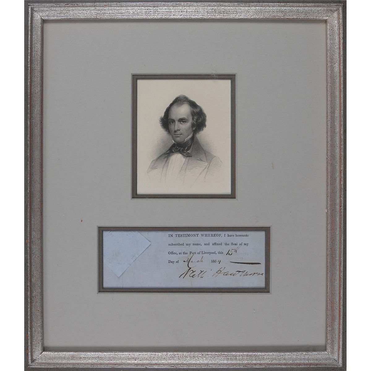 Partial self-contained partly-printed DS, signed “Nath: Hawthorne,” one page, 5.75 x 2, March 15, 1854. Lower portion of a document signed as American consul at the Port of Liverpool. Double-matted and framed with a portrait of Hawthorne to an overall size of 11 x 12.75. In fine condition.