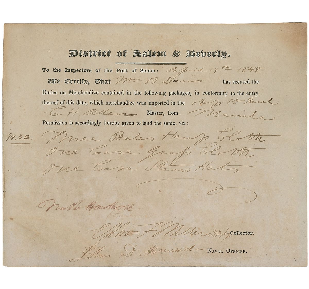 Partly-printed DS, signed “Nathl. Hawthorne,” one page, 8.5 x 7, April 19, 1848. Customs document for the district of Salem and Beverly. In part: “We certify, that Wm. B. Davis has secured the Duties on Merchandize contained in the following packages…imported in the ship St. Paul C. H. Allen Master, from Manila…Three Bales Hemp Cloth, One Case Grass Cloth, One Case Straw Hats.” Signed at the conclusion by Hawthorne and two other officials. In very good condition, with central vertical and horizontal folds (professionally reinforced on the reverse), small areas of professionally repaired paper loss to edges, and light scattered staining.