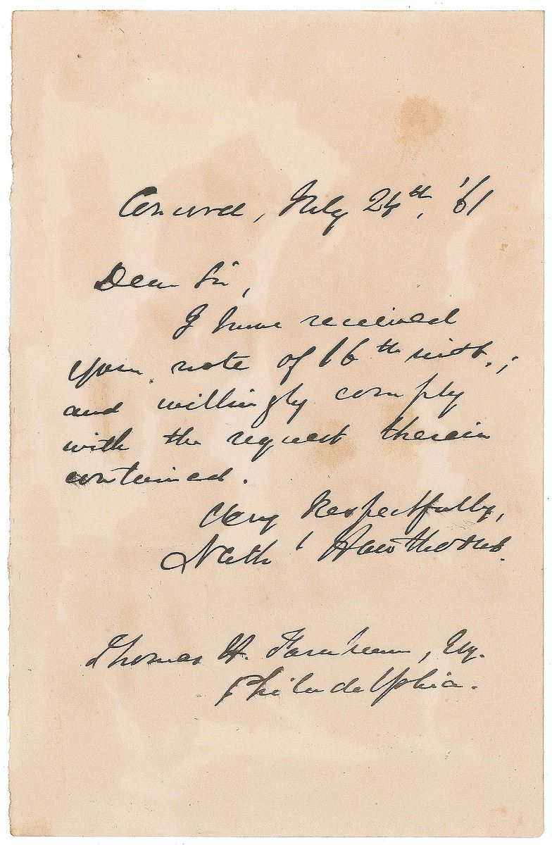 Boldly penned ALS signed “Nath'l Hawthorne,” one page, 4.5 x 7, July 24, 1861. Letter to a gentleman in Philadelphia, in full: "I have received your note of the 16th inst; and willingly comply with the request therein contained." In very good to fine condition, with irregular light toning from old adhesive residue on the reverse.