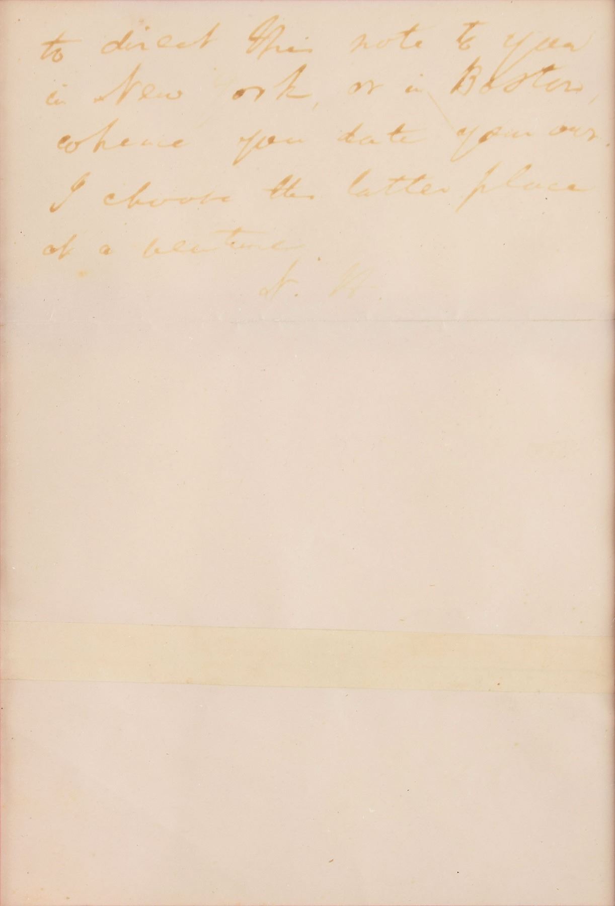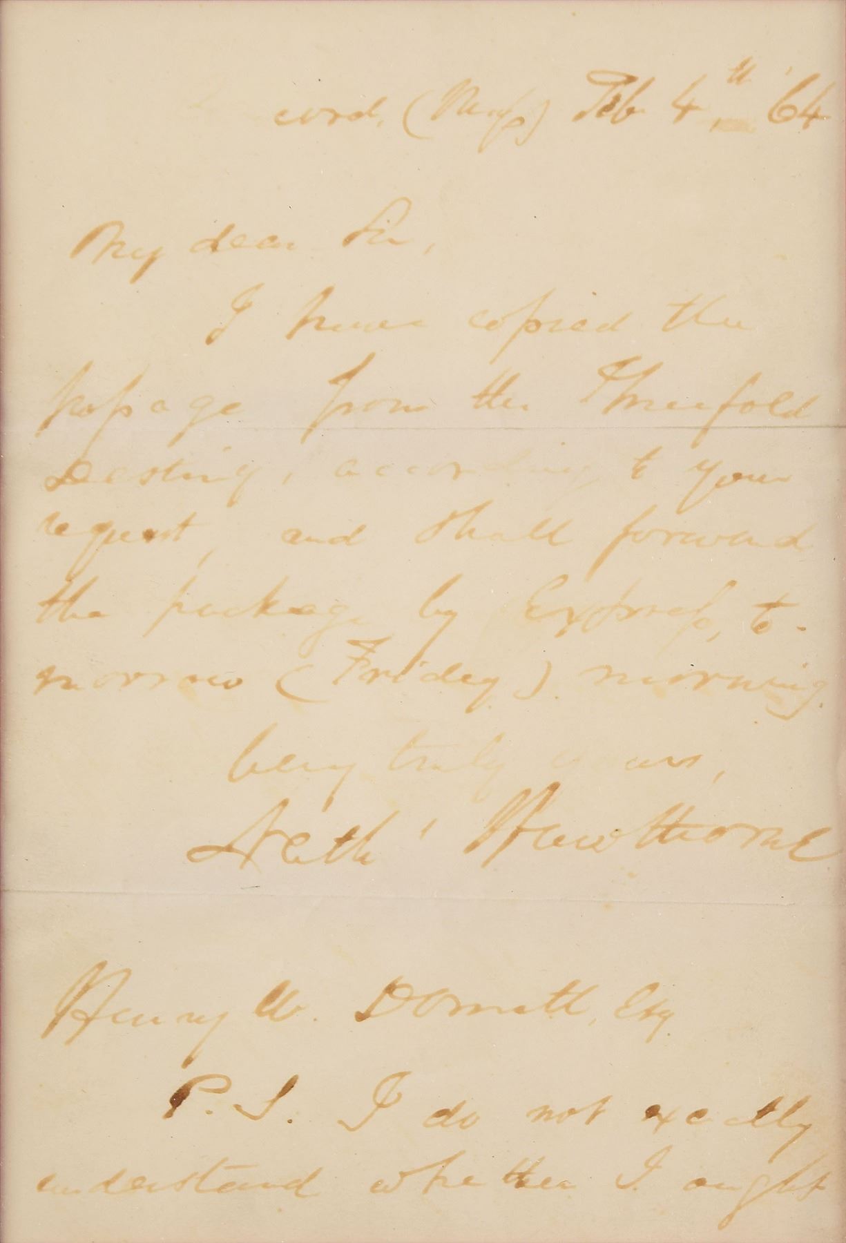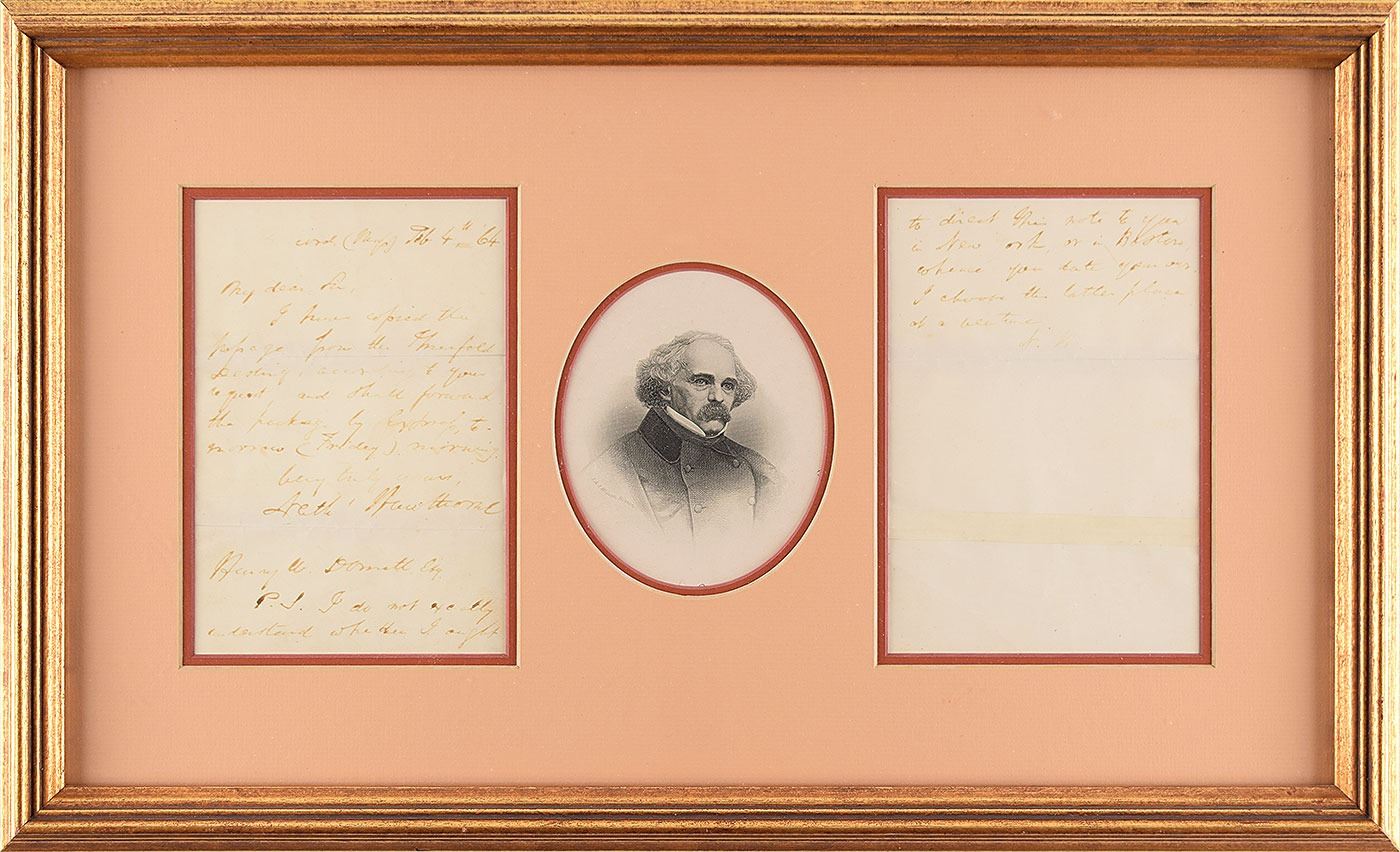 ALS signed “Nath'l Hawthorne,” two pages, 4.75 x 7, February 4, 1864. Letter to Henry W. Donett, in part: "I have copied the passage from the Threefold Destiny, according to your request and shall forward the package by express tomorrow (Friday) morning." He adds a postscript, initialed "N. H.," in part: "I do not exactly understand whether I ought to direct this note to you in New York, or in Boston…I choose the latter place at a venture." Double-matted and framed with an engraved portrait to an overall size of 21.75 x 13.25. In very good to fine condition, with reinforcements to the horizontal mailing folds. 'The Threefold Destiny' was a fairy legend by Hawthorne that appeared in his short story collection Twice-Told Tales.