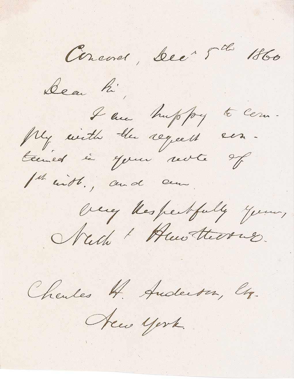 Brief ALS signed “Nathl. Hawthorne,” one page, 4.5 x 5.75, December 5, 1860. Hawthorne writes to Charles H. Anderson in New York City. In full: “I am happy to comply with the request contained in your note of 1st inst., and am, very respectfully yours….” Trimmed bottom edge, tiny edge tear, and faint show-through at two top corners from glue spots on reverse, otherwise fine, bright condition.