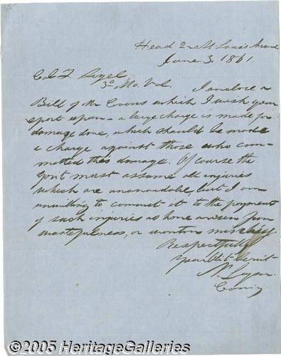 <B>Nathaniel Lyon Civil War Autograph Letter Signed</B></I> "N. Lyon" One page, 8.25" x 10.25", 1861 June 3, Head Quarters St. Louis Arsenal, to Col F(ranz) Sigel. In part: "... Of course the Govt must assume all injuries which are unavoidable, but I am unwilling to commit it to the payment of such injuries as have arisen from wastefulness, or wanton mischief." Lyon was put in charge of the St. Louis arsenal at the outbreak of the war. He immediately broke up Camp Jackson, where the secessionist governor, Claiborne F. Jackson, had quartered the state militia. By the spring of 1861, Lyon had subdued all the hostile sections of the state. When a Confederate force from Arkansas advanced into Missouri and was joined by Missouri's secessionist militia, Lyon attacked them at Wilson's creek, Aug. 10. He was killed in the battle. Sigel was in command of the German troops in the St. Louis area. He served in Missouri during 1861 and then was ordered east where he spent the remainder of the war. Folds, ink smear in closing not affecting signature, else fine. <I>Accompanied by COA from PSA/DNA.</B></I>