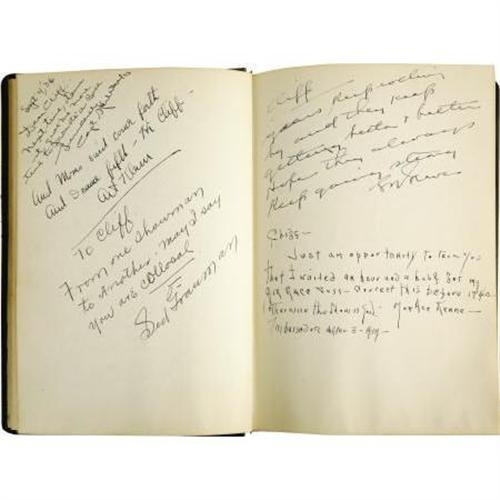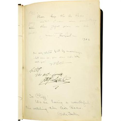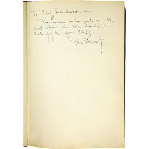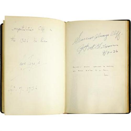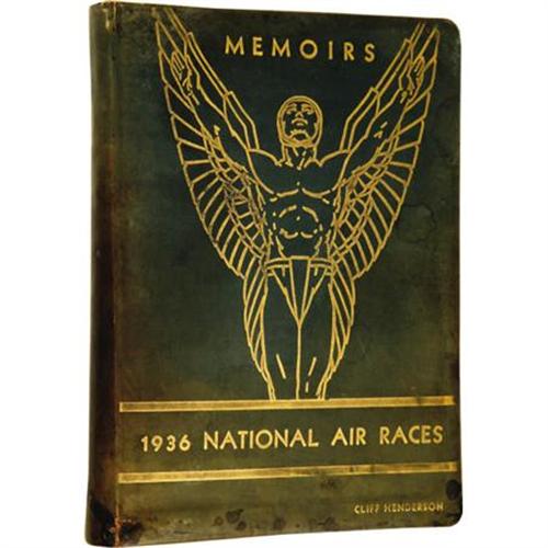 <B>Star-Studded 1936 National Air Races Autograph Book,</B></I> over 200 pages, 8vo (7.5” x 10”), Los Angeles, California, green leather covers, personalized “Cliff Henderson” in gold type on front. As the promoter of the races between 1928 and 1939, Henderson was an entertainment V.I.P in his own right and, as such, managed to have many celebrities sign this book. Included here are signatures of such Hollywood greats as Jack Benny, Eddie Cantor, Gary Cooper, Cliff Edwards, Cary Grant, Ginger Rogers, James Stewart, and Robert Young. There is also a note signed by Amelia Earhart reading, “<I>Please keep the air Races going until I can win something better than fifth place in the Bendix.</B></I>” Water stains on endpapers, otherwise internally fine. Cover soiled, however binding still tight. Overall very good condition. <I>From the collection of Cliff Henderson.</B></I><BR><BR><b>Shipping:</b> Books & Catalogs (<a target="_blank" href="http://www.heritageauctions.com/common/shipping.php">view shipping information</a>)