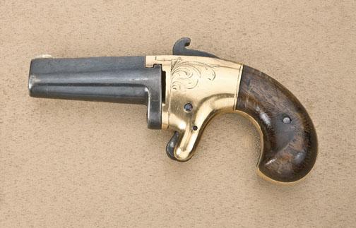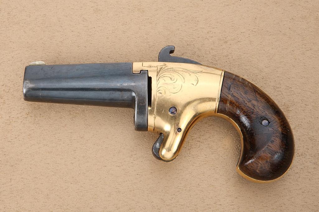 National Arms Co .41 caliber derringer resembling #2 Colt, serial #1510. Refinished condition, barrel address not visible. Grips lightly refinished, action working, frame shows engraving and light re-gold plate.Scarce. Est: $400 - $600