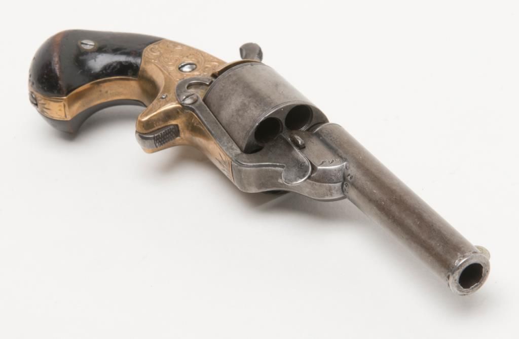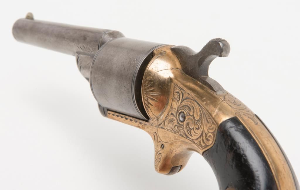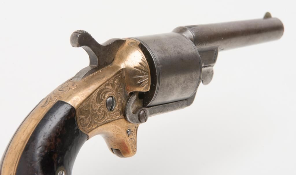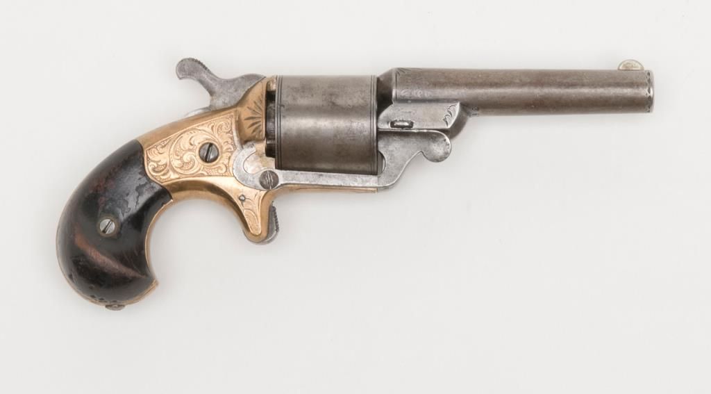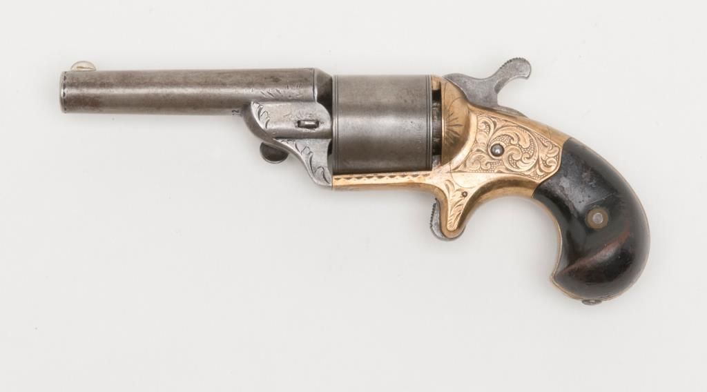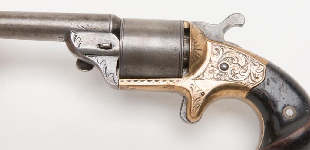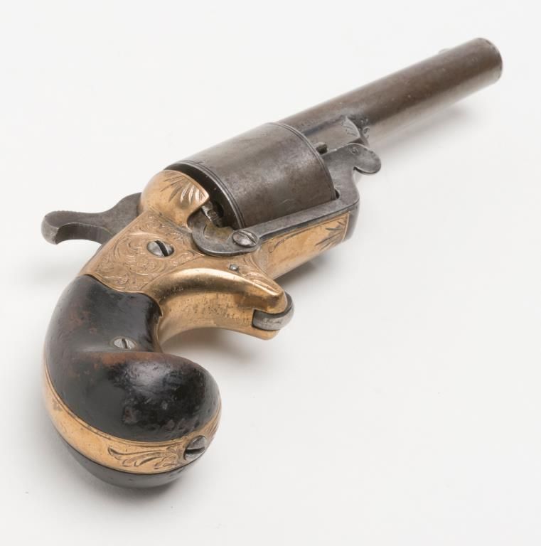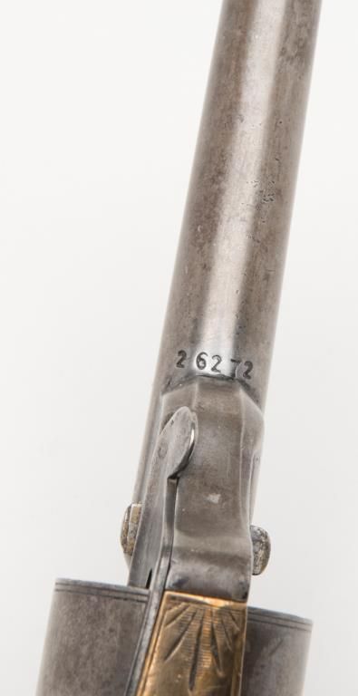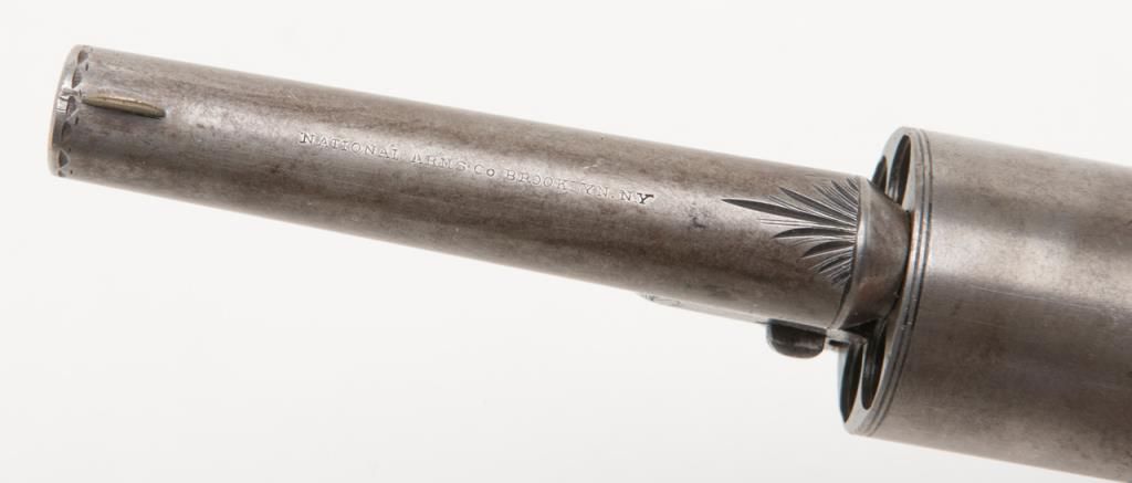 National Arms Co. front loading teat-fire spur trigger revolver, .32 cal., 3-1/4” round barrel, blue finish, brass frame, engraved, wood grips, #26272 in overall good condition showing a pleasing patina to metal surfaces, good action,bore, engraving and grips. (Antique). Est.: $150-$300.