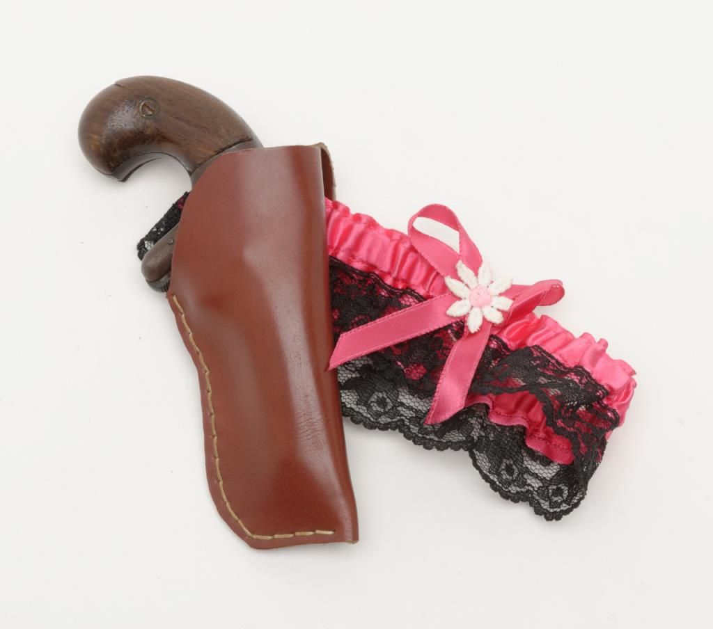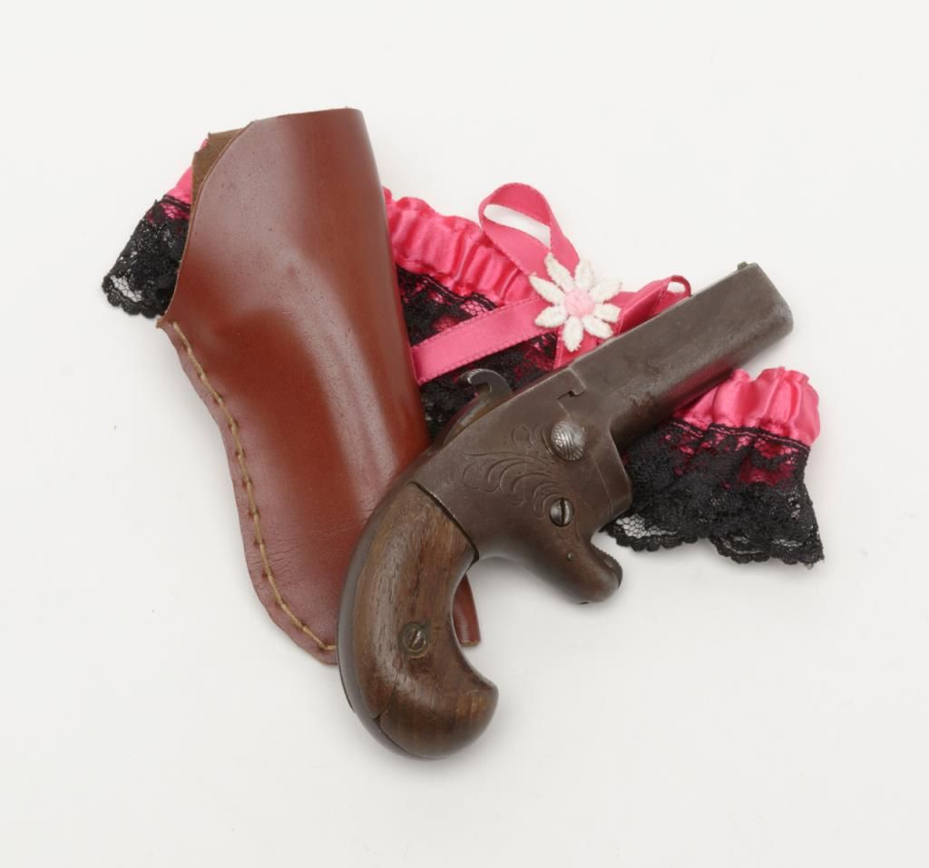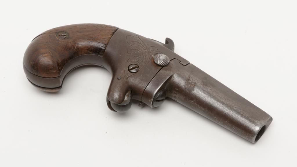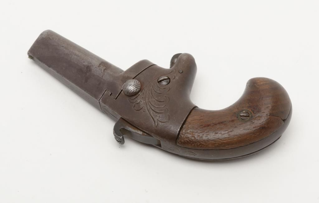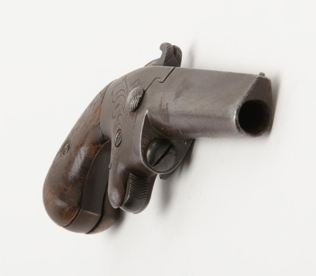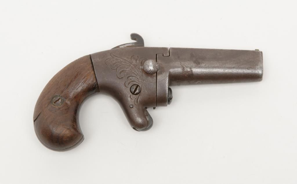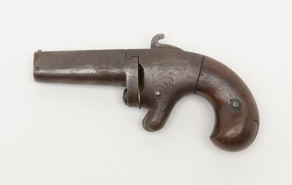 National Arms Company .41 caliber rimfire Derringer in fair to good overall condition, serial number 11613 before patent acquired by Colt firearms. This exact pistol was the 1st gun acquired by William A. Gary from his grand daddies garage in the 1920s to 1930s. The grips are old handmade replacements. The metal surfaces are a dark brown with some scattered pitting and erosion and faint barrel address with light engraving. A modern holster with garter to hang it on isincluded. . The collection of William a Gary consigned by his estate. Est.: $350-$700