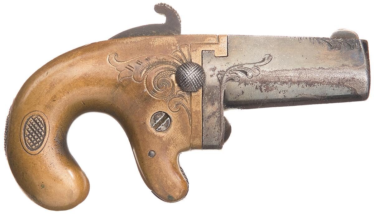 First produced by Moore and then by National Arms from 1865 to 1870, with total quantity estimated at 6,000 equally divided between the two companies. This example was manufactured by National with the top of the barrel marked "NATIONAL ARMS CO. BROOKLYN, N.Y." and the underside marked "PAT FEB 24 1863". The derringer has the scarce 2 inch silver plated barrel and has no provisions for an extractor. Half-moon blade front and hammer notch rear sights. The brass frame features a broad scroll engraving on a punch dot background with a floral design around the hammer. The barrel has wedges of floral scrollwork at the breech and at the front sight. It has a serrated spur trigger and hammer, with the grip area having three checkered panels.