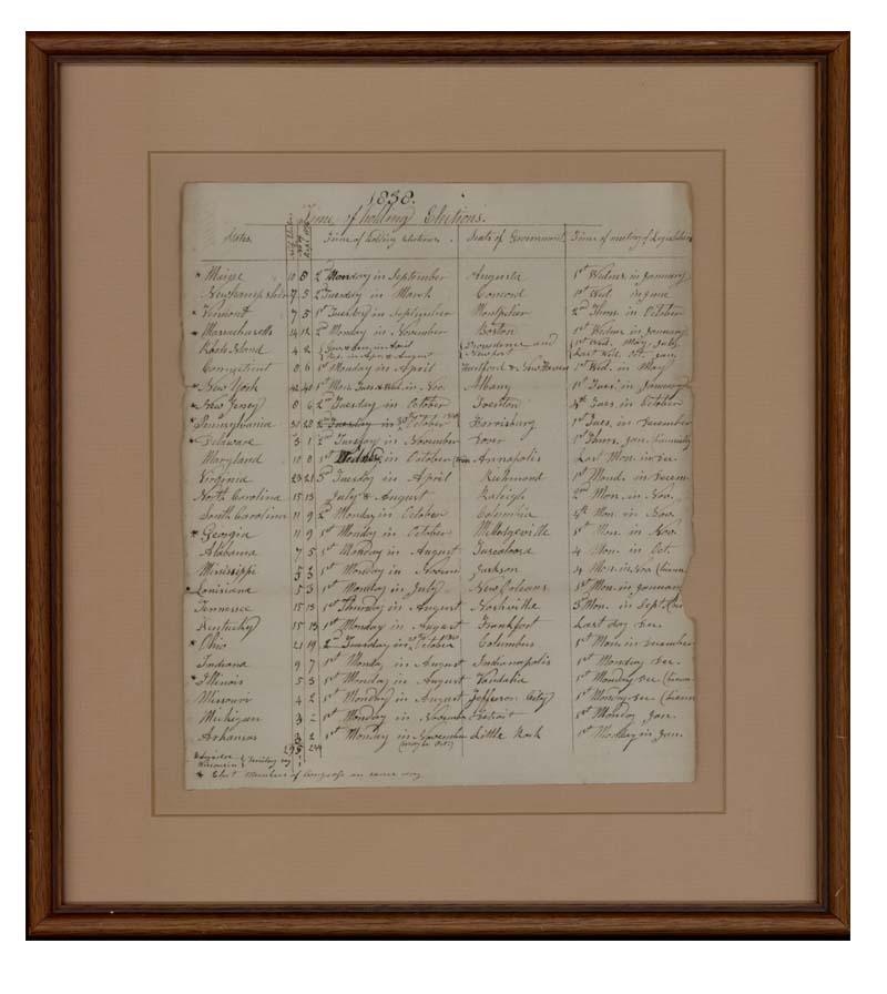 One page, 7 ¾” x 9”, mounted in a 12 ½” x 13 ½” brown wood frame. The document lists pertinent information for each state regarding the 1838 House election. This information includes the seat of government in all states, the time elections are to be held, the time each legislature is scheduled to meet, and the number of electors and representatives from each state.