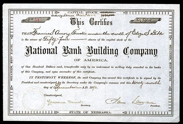 Nebraska, 1892, 54 Shares, Issued Stock, Black print on blue paper, VF condition.