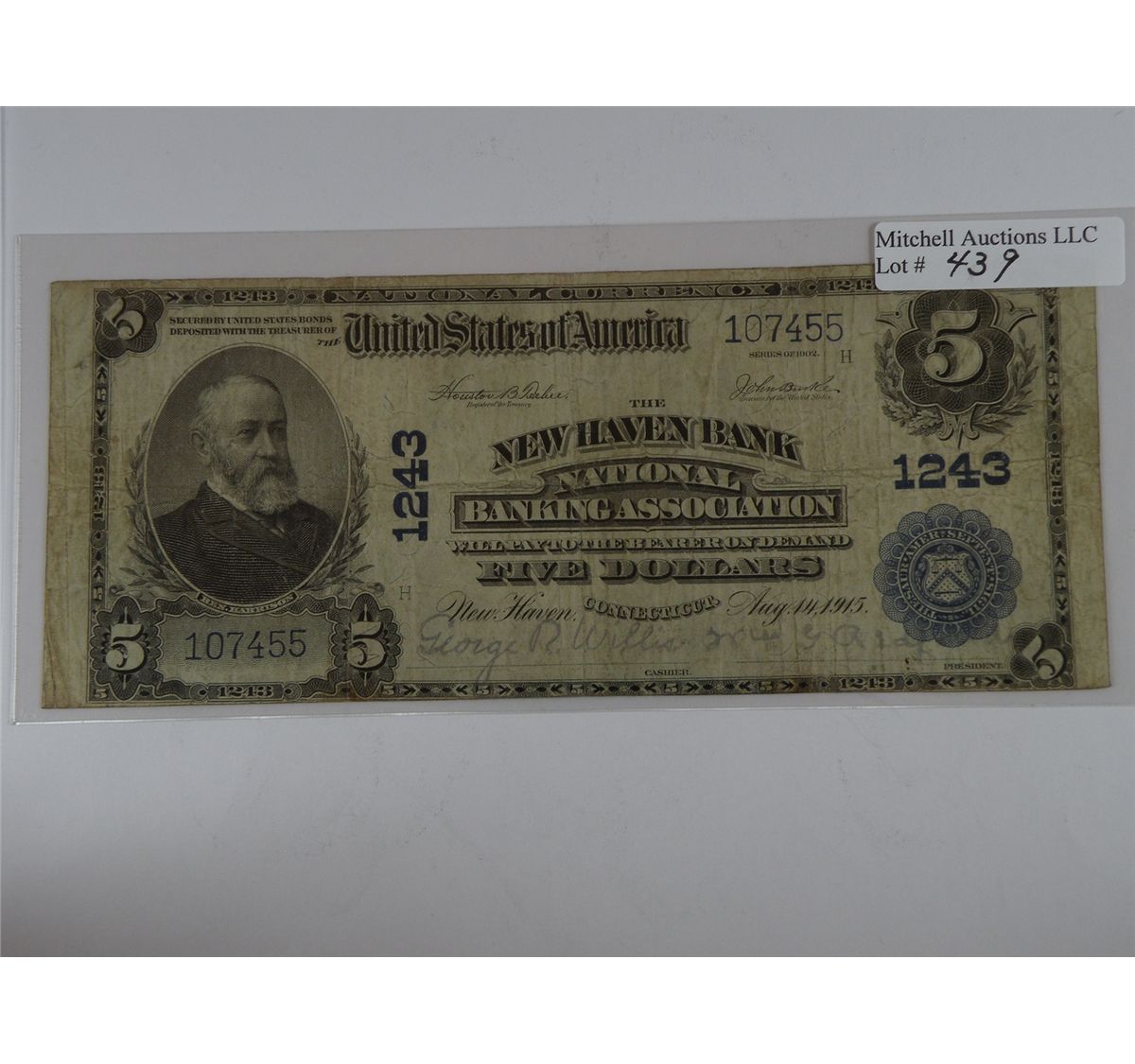 National Bank Note. $5 Series of 1902 Plain Back. Charter #1243. The New Haven Bank National Banking Association, New Haven, CT. Fine with pinholes. Est.$115