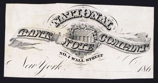 New York, NY, 186x, Letterhead, business card or related proof of National BNC with date, Ornate lettering, Located at No.1 Wall Street, New York City, 3.8 x 2 inches, black on india paper, from NBNC sample book, Fine to VF with wrinkling and light stains or toning, Rare, NBNC.