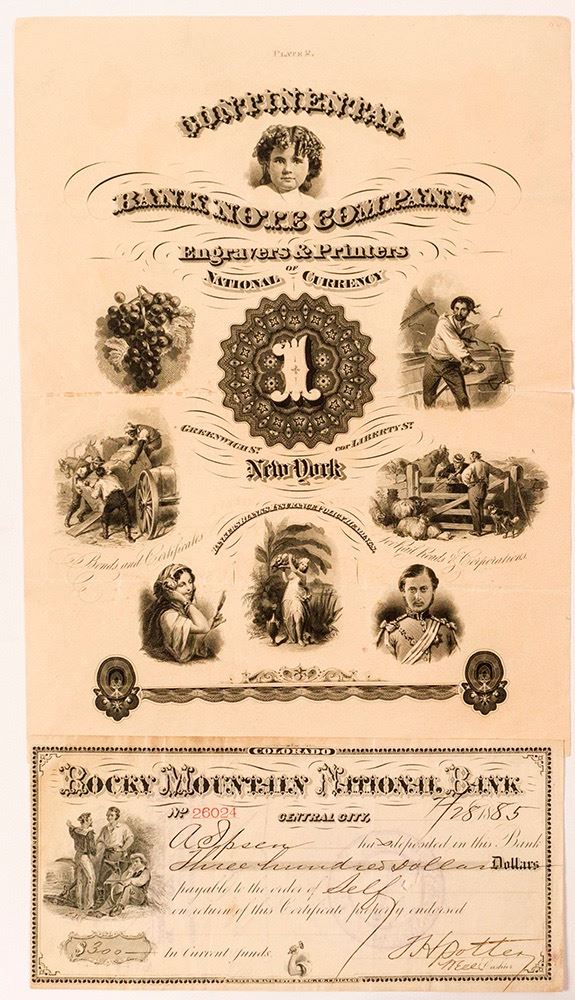 1) Continental Bank Note Company Engravers Plate. This sheet would have been sent to National Banks with samples of what the Continental Company could do. Intense competition for contracts to engrave and print U.S. Treasury bank notes raged among engraving firms prior to 1876. The struggle ended that year, when the government assumed responsibility for printing all currency. Founded in early 1863, the Continental Bank Note Company (CBNCo) promised greater efficiency and profitability than its competitors. It melded business savvy, independent and highly skilled engraving, and well-connected entrepreneurs to secure important contracts, among them the U.S. Treasury Department's sole currency contract. CBNCo triumphed where the National Bank Note, American Bank Note, and Butler & Carpenter failed, an incredible accomplishment for a newly-formed company. And this engraver's sample sheet is what helped to sell this company! Three horizontal folds. Middle is heavy. 1.5" tear on right. 2) Rocky Mountain National Bank check, Central City, Colorado. 1885. From TH Potter to A Ipsen. Potter was also the treasurer of the Central and Middle Park Wagon Road in 1871. Light discoloration top and left. Date: c1870, 1886 Location: HWAC # 53580