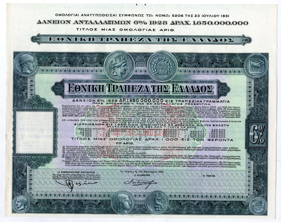 Greece….., 1928. 1000 Drachma Specimen 6% Coupon Bond, Black on green border and m/c underprint, Printed in Greek, Specimen overprint, AU-Unc condition, BWC.