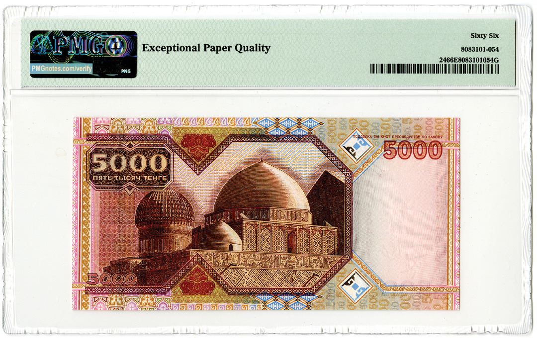 Kazakhstan. 2001. 5000 Tenge, P-24, Issued banknote, S/N AB1604612, Watermark: Al-Farabi, PMG graded Gem Uncirculated 66 EPQ.