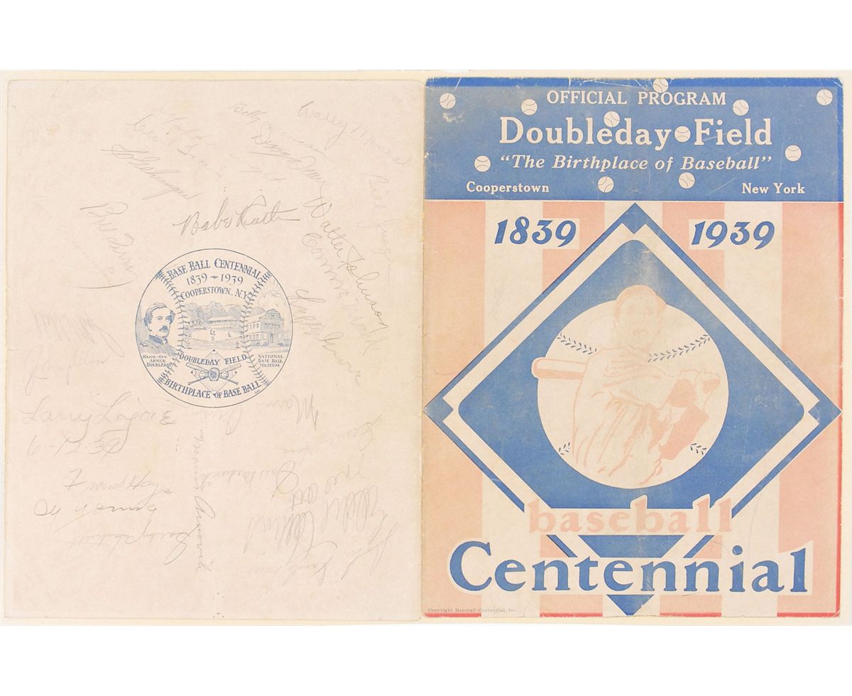 Two sets of adjoined pages, consisting of the front and back cover and scorecard from the program for the June 12, 1939 exhibition game that took place at the grand opening of the National Baseball Hall of Fame, 16.5 x 10.5 unfolded, signed in ink and pencil by 21 Hall of Fame players and a number of other non-Hall of Famers. Hall of Fame signers are: Babe Ruth (very bold pencil), Cy Young (ink), Walter Johnson (ink), Ty Cobb, Mel Ott, Larry Lajoie, Tris Speaker, Arky Vaughan, Dizzy Dean, Connie Mack, Gabby Hartnett, Eddie Collins, Hank Greenberg, Lefty Grove, Joe Medwick, Bill McKechnie, Bill Klem, Carl Hubbell, Billy Herman, Charlie Gehringer, and Bill Terry. Other signers include: Wally Moses, Billy Jurges, Terry Moore, and Jimmie Wilson. Both pieces are permanently affixed to slightly larger mounts. In very good condition, with a light overall shade of toning, scattered creases, rubbing wear to the front cover, and staple holes along central fold.