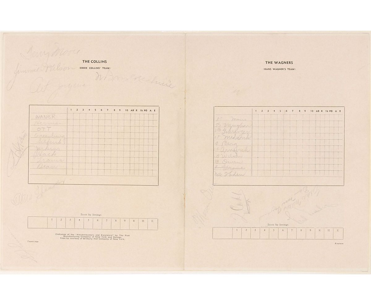 Even though Hall of Fame balloting began in 1936, the Hall officially opened in 1939 to celebrate the centennial of Abner Doubleday's so-called invention of the sport. On the day of its dedication, June 12, baseball legends past and present descended on the sleepy village of Cooperstown, New York, for the Hall's first induction ceremonies. The coterie included 11 members of the inaugural induction class and 32 Major Leaguers in their prime—two from each team, and nine of whom would go on to be Hall of Famers themselves—who were to play in an exhibition game at Doubleday Field in honor of the historic event. Inductees Honus Wagner and Eddie Collins each managed a team, and ‘The Wagners’ managed to beat ‘The Collins’ 4-2 in the seven inning ballgame, scoring two runs in the sixth behind doubles from Arky Vaughan and Frank Hayes, and a single by Morris Arnovich. The undisputed highlight of the game was a pinch hit appearance by Babe Ruth—then 44 years old and four years removed from his professional career—for Wagner’s squad. The result was a disappointing foul out to the catcher, but his mighty swing did not fail to impress the crowd. Some lucky member of the crowd managed to meet the players and get this program signed—even filling out the lineups but failing to score the game, probably too awestruck by the spectacle at hand. It is a great reminder of a historic event in baseball history, when a group of the greatest players in the world came together to celebrate America’s national pastime.